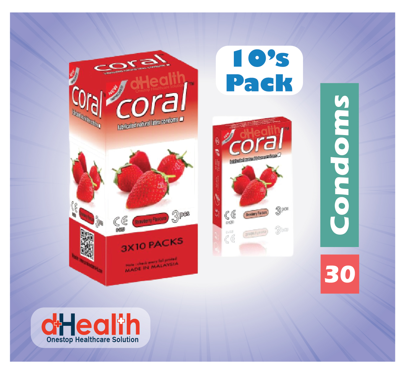 • Brand: Coral • Flavor: Strawberry • Material: Natural Latex (Low Protein) • Quantity: 30 Pcs in 10 Packets / 1 Box • Length: 180mm • Width: 52mm +/- 2mm • Thickness: 0.065mm +/-0.015mm • Lubricant: Silicon Oil 450mg +/- 150mg • Country of Origin: Malaysia