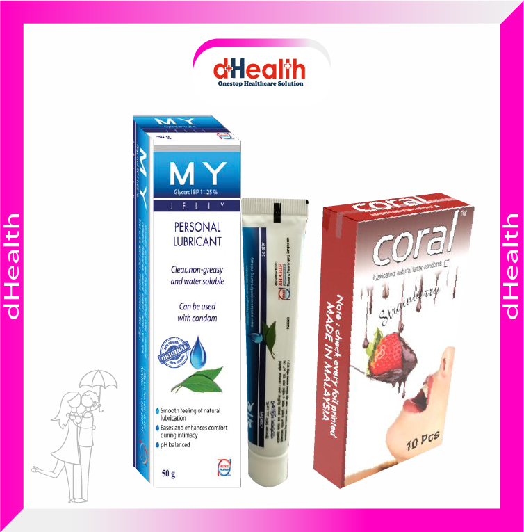 Coral Strawberry Flavored Lubricated Natural Latex Condoms Single Pack(1x10)=10Pcs & MY Jelly 50g Personal Lubricate Combo Pack