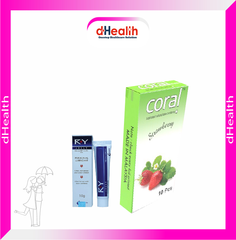 Coral Strawberry Flavored Lubricated Natural Latex Condoms Single Pack(1x10)=10Pcs & RY Jelly 10g Personal Lubricate Combo Pack