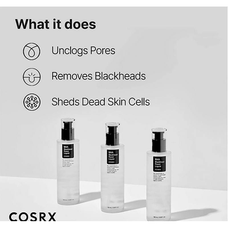COSRX BHA Blackhead Power Liquid is a highly effective chemical exfoliator that refines the look of enlarged pores and leaves skin brighter.Formulated with 4% BHA, this concentrated toner visibly diminishes enlarged pores and dead skin cells. Contains natural BHA ingredients like willow bark water to maximize benefits without irritation. BHA deeply penetrates pores, helps clear clogged pores, and gently exfoliates dead skin cells, giving the skin its natural glow. This product helps remove excess sebum and blackheads so you can find healthy and hydrated skin.