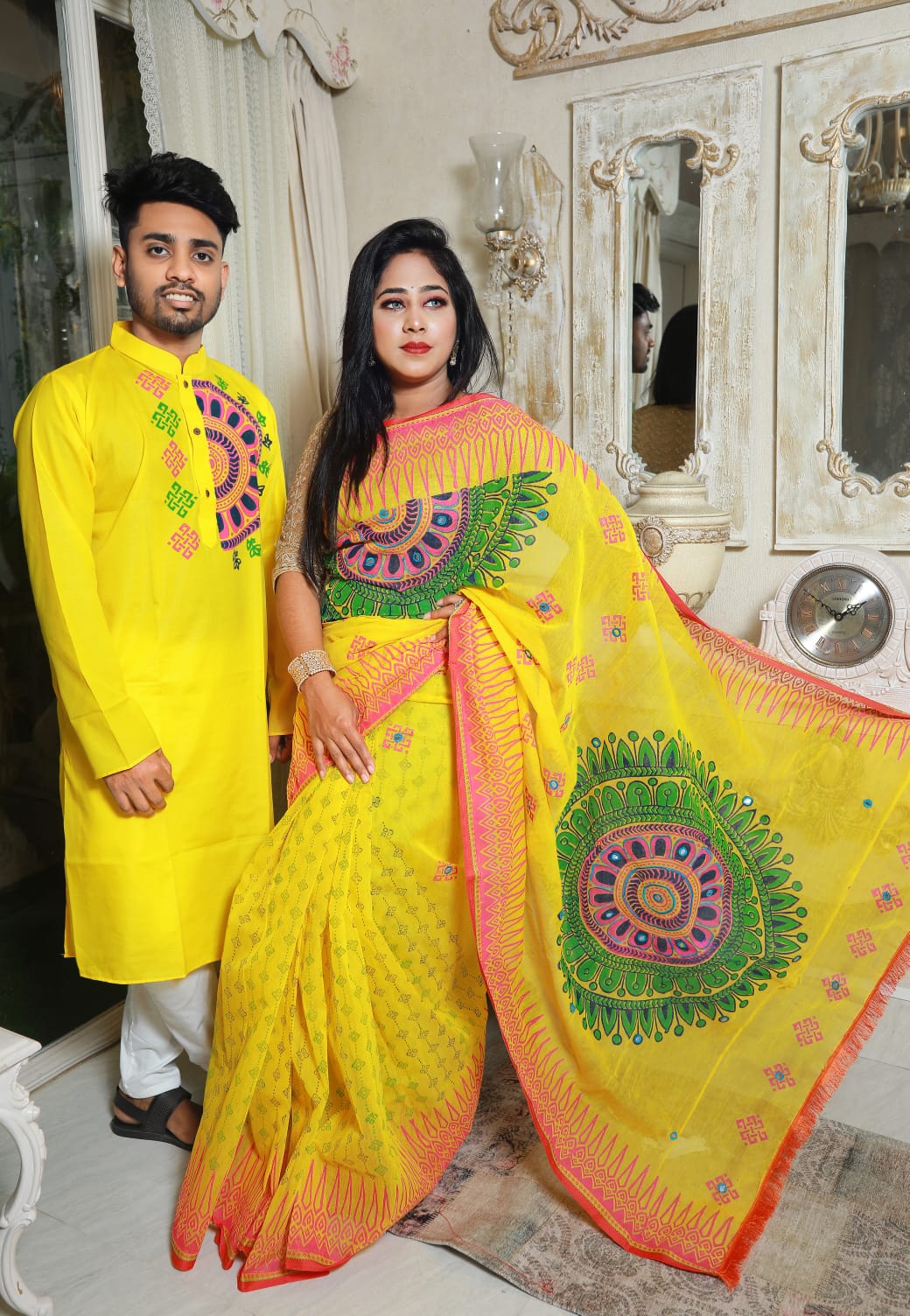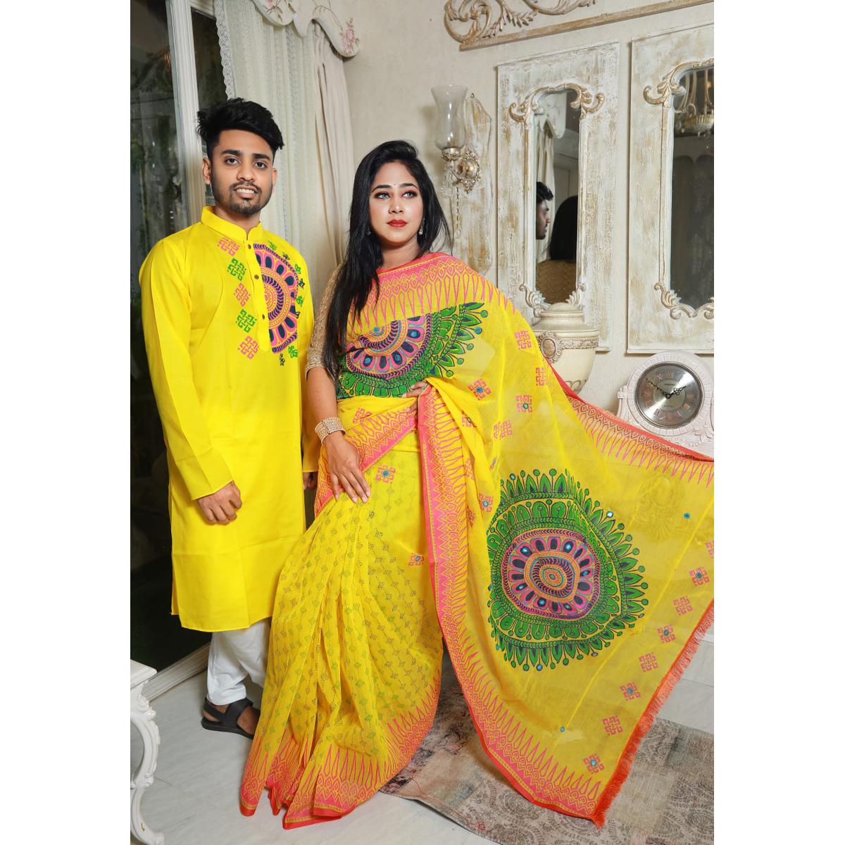 Couple Set Block Print Yellow Color Saree and Panjabi for Men women - Yellow