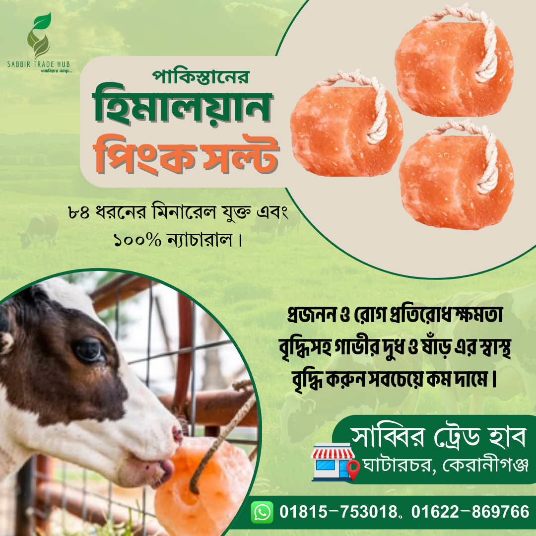 প্রধান বৈশিষ্ট্য: দুধ উৎপাদন বৃদ্ধি করেগরুর ল্যাকটেশন উন্নত করতে সাহায্য করে। ✅ গবাদিপশুর স্বাস্থ্য ভালো রাখেহাড়ের মজবুততা, হজম ও রোগ প্রতিরোধ ক্ষমতা বৃদ্ধি করে। ✅ ১০০% প্রাকৃতিক ও বিশুদ্ধকোনো কৃত্রিম উপাদান নেই, খাঁটি হিমালয়ান লবণ। ✅ সব ধরণের গবাদিপশুর জন্য উপযুক্তগরু, মহিষ, ছাগল, ভেড়া, ঘোড়া ইত্যাদির জন্য আদর্শ। ✅ পানির চাহিদা বাড়ায়ডিহাইড্রেশন ও খনিজের ঘাটতি প্রতিরোধ করে