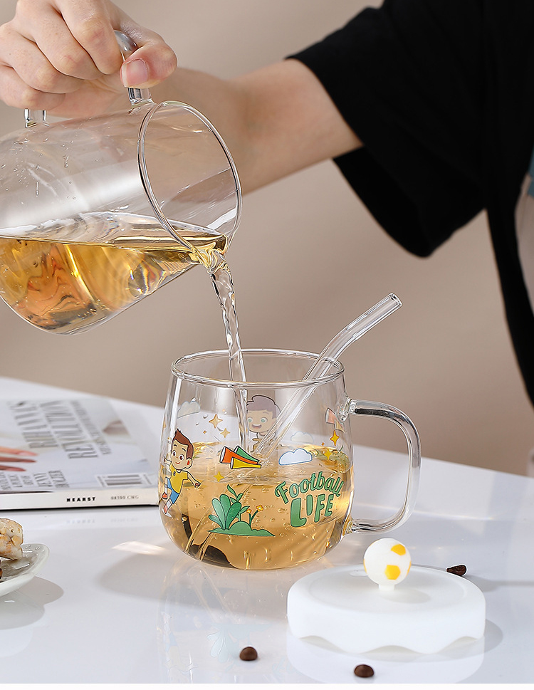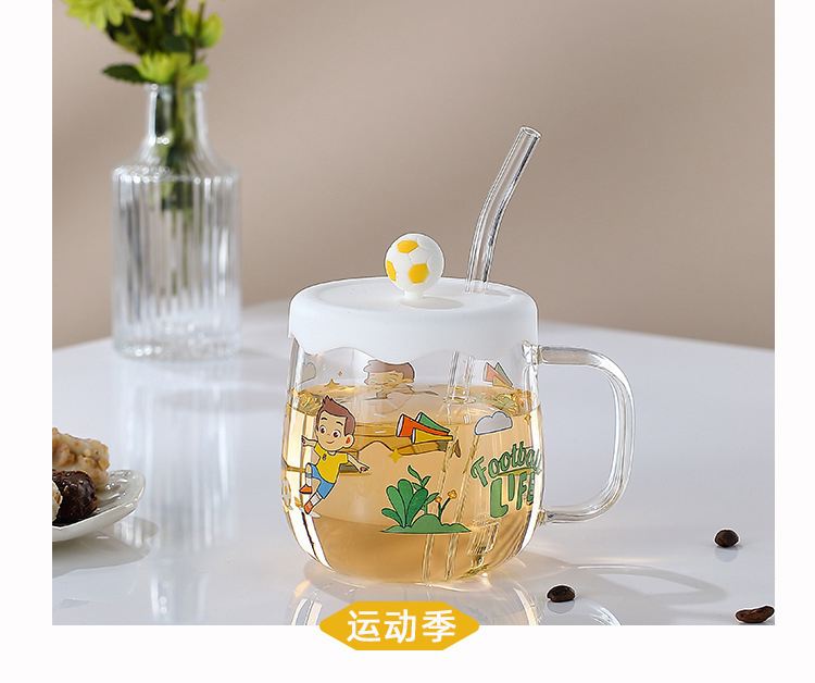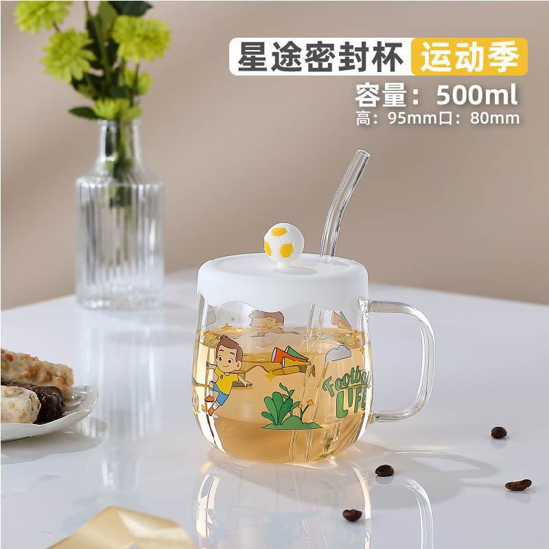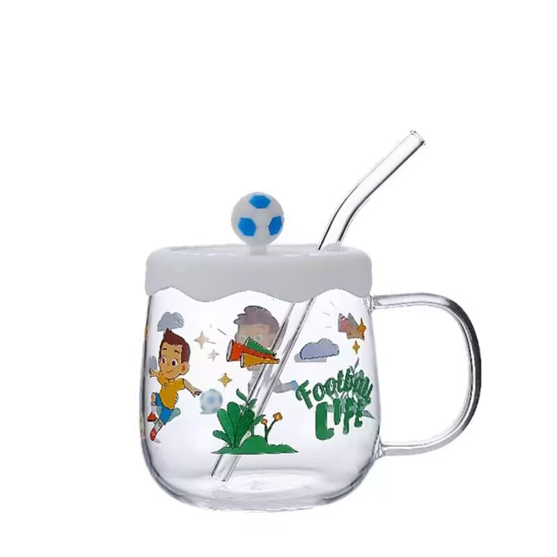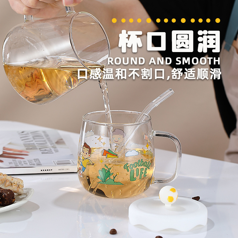Creative printed glass straw cup with lid high borosilicate glass heat-resistant mug