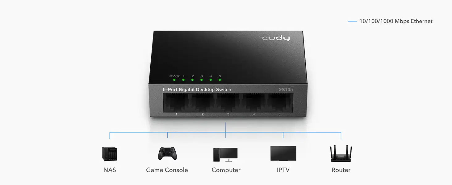 The Cudy GS105 4.0 5 Port Unmanaged Gigabit Desktop Switch is a simple yet powerful networking device that delivers high-speed connectivity for homes, offices, and small businesses. With 5 Gigabit Ethernet ports, it ensures seamless data transfer, smooth video streaming, online gaming, and stable internet for multiple devices. This switch is ideal for desktop use without creating noise or consuming much space.