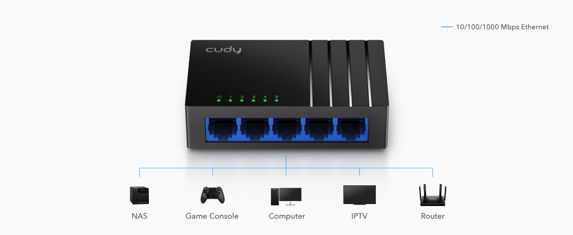 Five 10/100/1000 Mbps non-blocking Ethernet ports enable instant transferring of data without mutual interference.