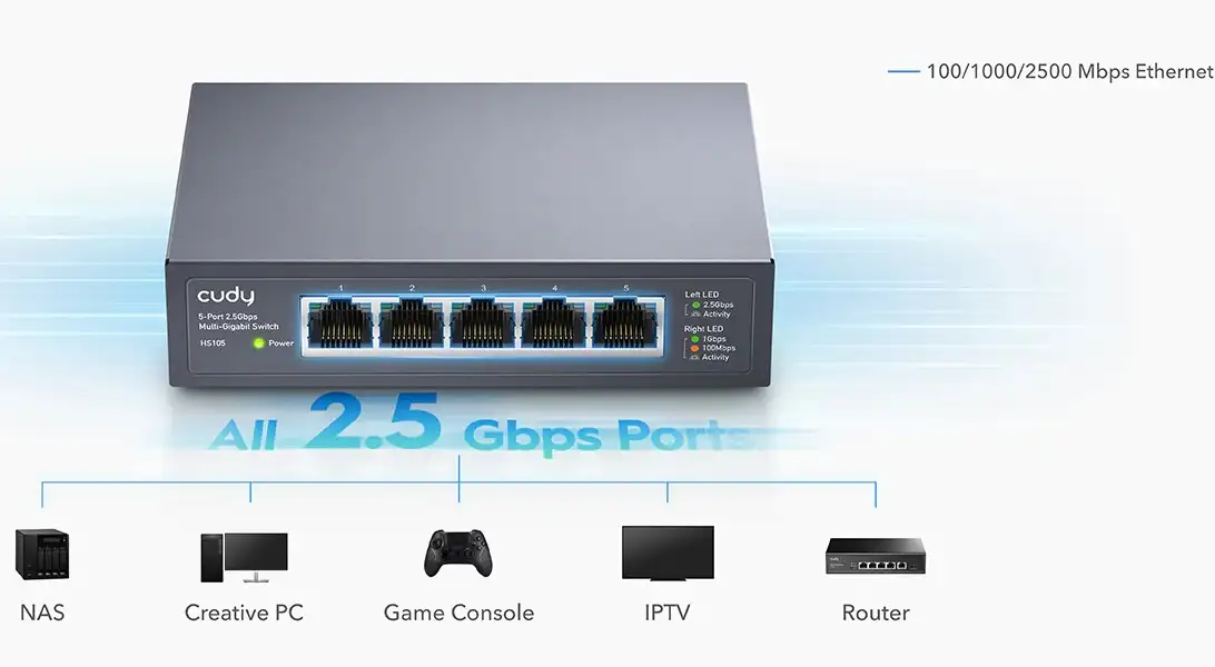 - Blazing-Fast 2.5G Ports: The Cudy HS105 features five 2.5G Ethernet ports for ultra-fast connectivity. Ideal for bandwidth-intensive activities like 4K streaming, online gaming, and large file transfers.