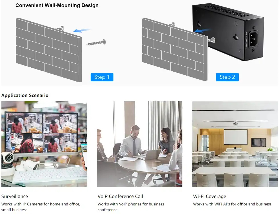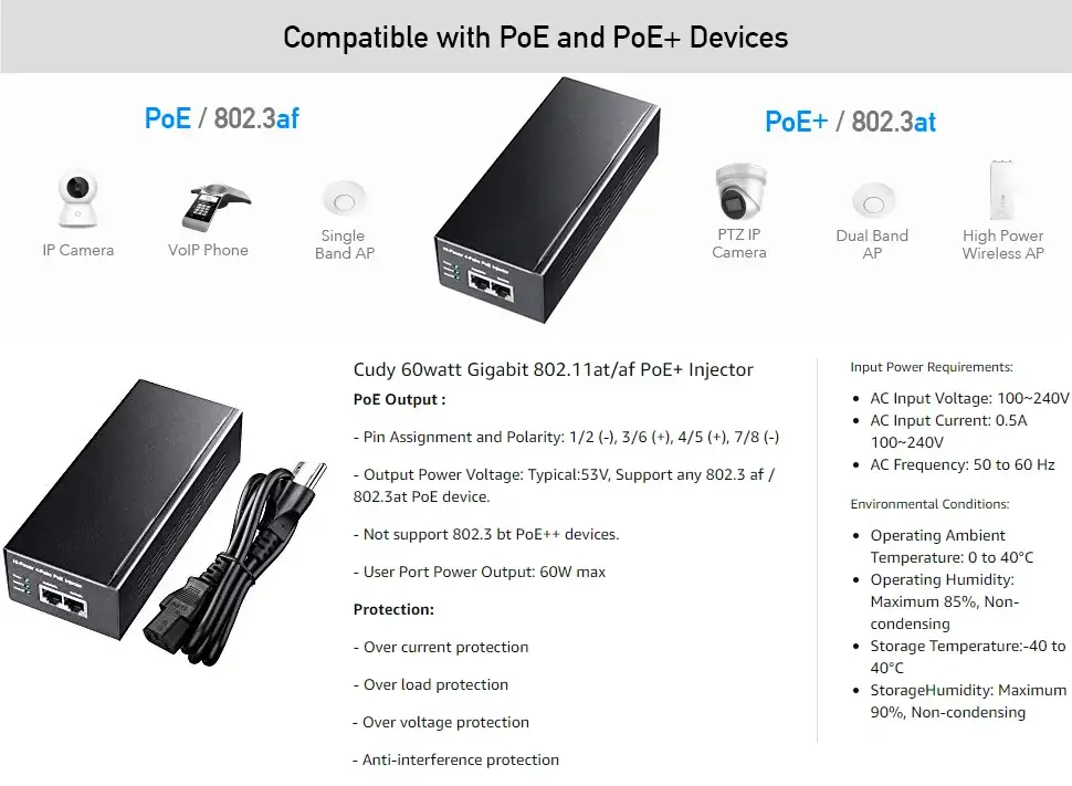The Cudy POE300 1.0 stands out due to its ability to deliver up to 60W of power per port with PoE++ technology, supporting high-powered devices like outdoor IP cameras and Wi-Fi access points. The injector is plug-and-play, requiring no configuration, which saves time during installation. Its Gigabit Ethernet support ensures high-speed data transfer while simultaneously powering devices. Additionally, the built-in surge protection safeguards connected devices, making it a reliable and durable networking solution.