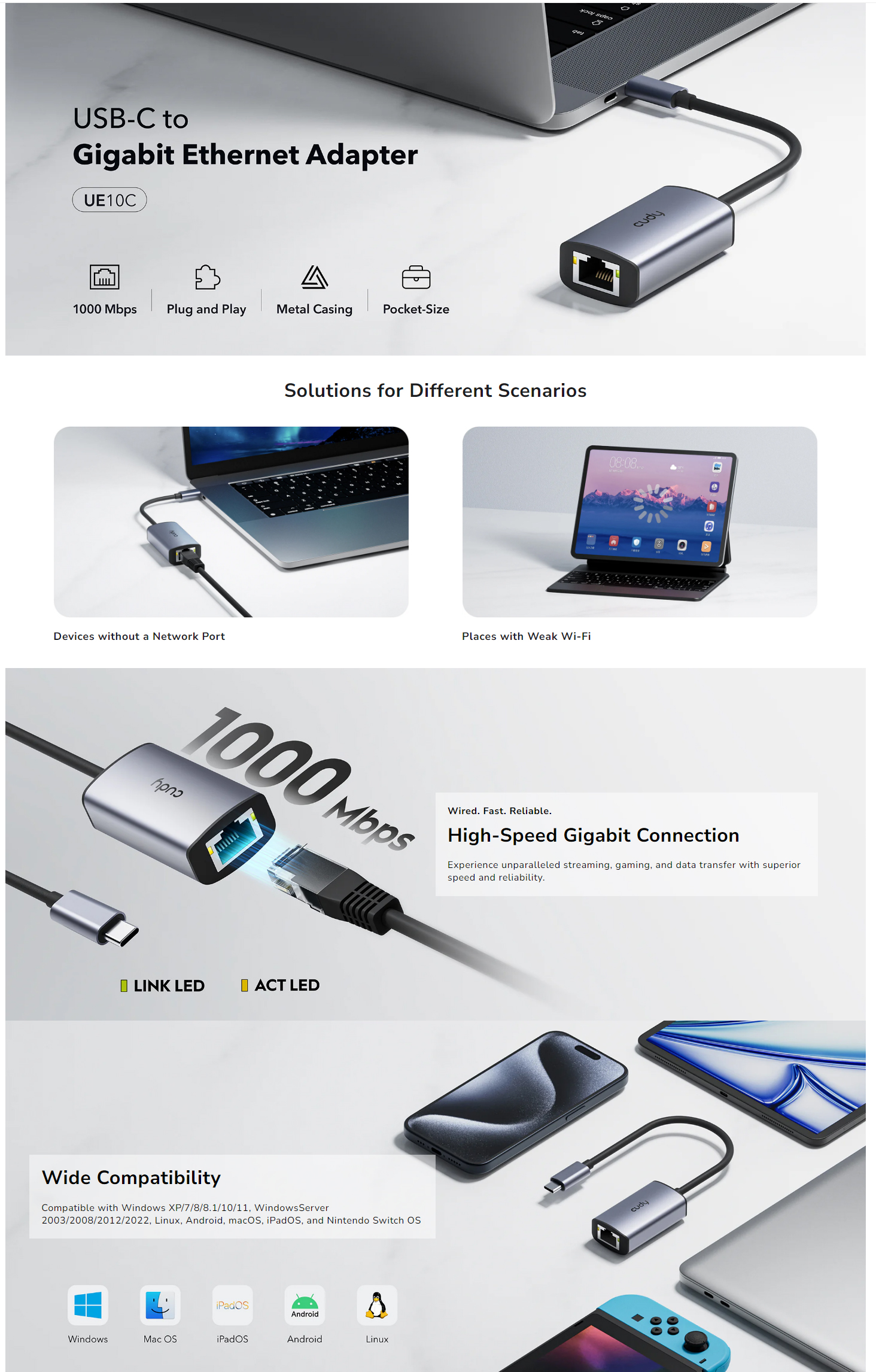 CUDY UE10C USB-C to Gigabit Ethernet Adapter - 10/100/1000 Mbps Ethernet Port - PC / Mac / iPad / iPhone / Android / Nintendo - Plug and Play - Wake on LAN, Flow Control