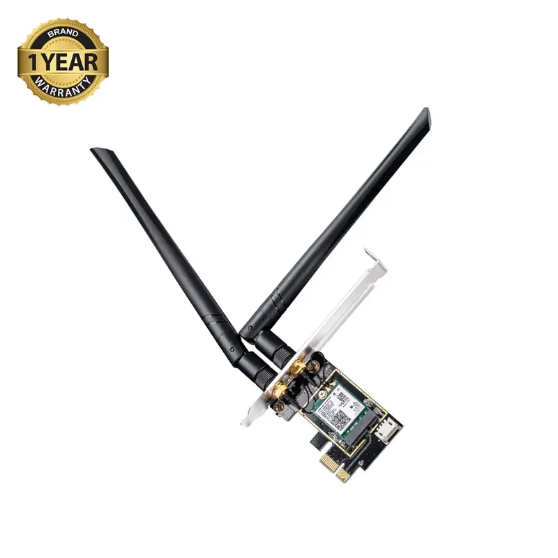 Brand - Cudy, Model - Cudy WE3000 1.0, Network Standards - Wi-Fi 6, Transfer Rate (Mbps) - 3000 Mbps, Frequency - 2.4GHz, 5GHz, Chipset - Intel AX200, AP Mode - Unmentioned, Antenna - Yes, Antenna Type - Detachable, Interface - PCIe, USB Version - Not Applicable, Wireless Security - WPA/WPA2/WPA3, Operating Temperature - 0 Degree C to 70 Degree C, Storage Temperature - -40 Degree C to 70 Degree C, Working Humidity - 10%-90%(non-condensing), Storage Humidity - 5%-90%(non-condensing), OS Supported - Windows 10/11 64-bit, Color - Black, Dimension - 65 x 45.5 x 16mm (Device Body), 15 x 221.5mm (Antenna), Weight (gm) - 71 gm, Others - 5 GHz Wi-Fi Speed: 2402 Mbps, 2.4 GHz Wi-Fi Speed: 574 Mbps, 5 GHz Wi-Fi Streams: 2T2R (2x2 MIMO), 2.4 GHz Wi-Fi Streams: 2T2R (2x2 MIMO), Wi-Fi Antennas: 2x Detachable, Detachable Wi-Fi Antennas Connector: RP-SMA Female, Hardware Requirement: Hardware Requirement, Requires a USB 9-PIN slot on the motherboard for the Bluetooth function, Max Wi-Fi Modulation: 1024-QAM, Max Wi-Fi Channel Width: 160 MHz, Bluetooth 5.2., Speciality - Wi-Fi Efficiency: OFDMA, MU-MIMO, BSS Color, Incredibly Smooth Experience., Certifications - FCC, CE, Package Contents - WE3000, Detachable Antennas, Bluetooth to 9-PIN USB Cable, Low-Profile Bracket, Installation Guide., Warranty - 1 Year, Country of Origin - China, Made in/ Assemble - China