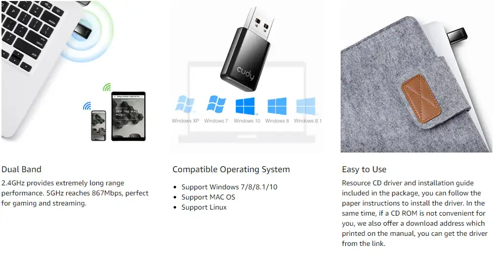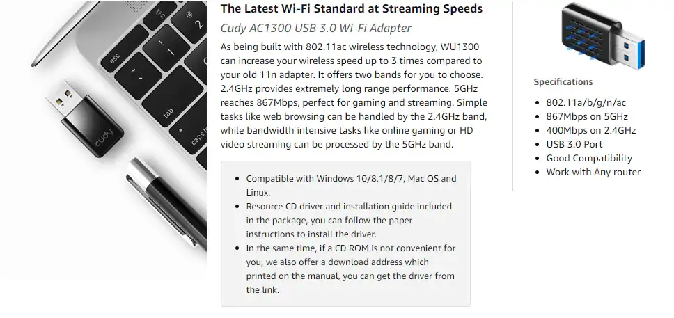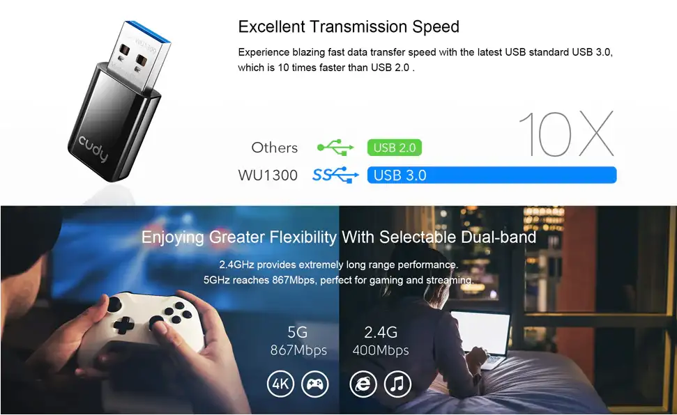 The Cudy WU1300 stands out because it brings next-level Wi-Fi speeds to older devices that lack built-in dual-band support. With speeds of up to 400 Mbps on the 2.4GHz band and 867 Mbps on the 5GHz band, it ensures lag-free performance even in high-demand situations. It also supports MU-MIMO technology, allowing multiple devices to connect efficiently without slowing down the network. Its plug-and-play capability and wide compatibility with Windows, macOS, and Linux make it a versatile choice for different users.