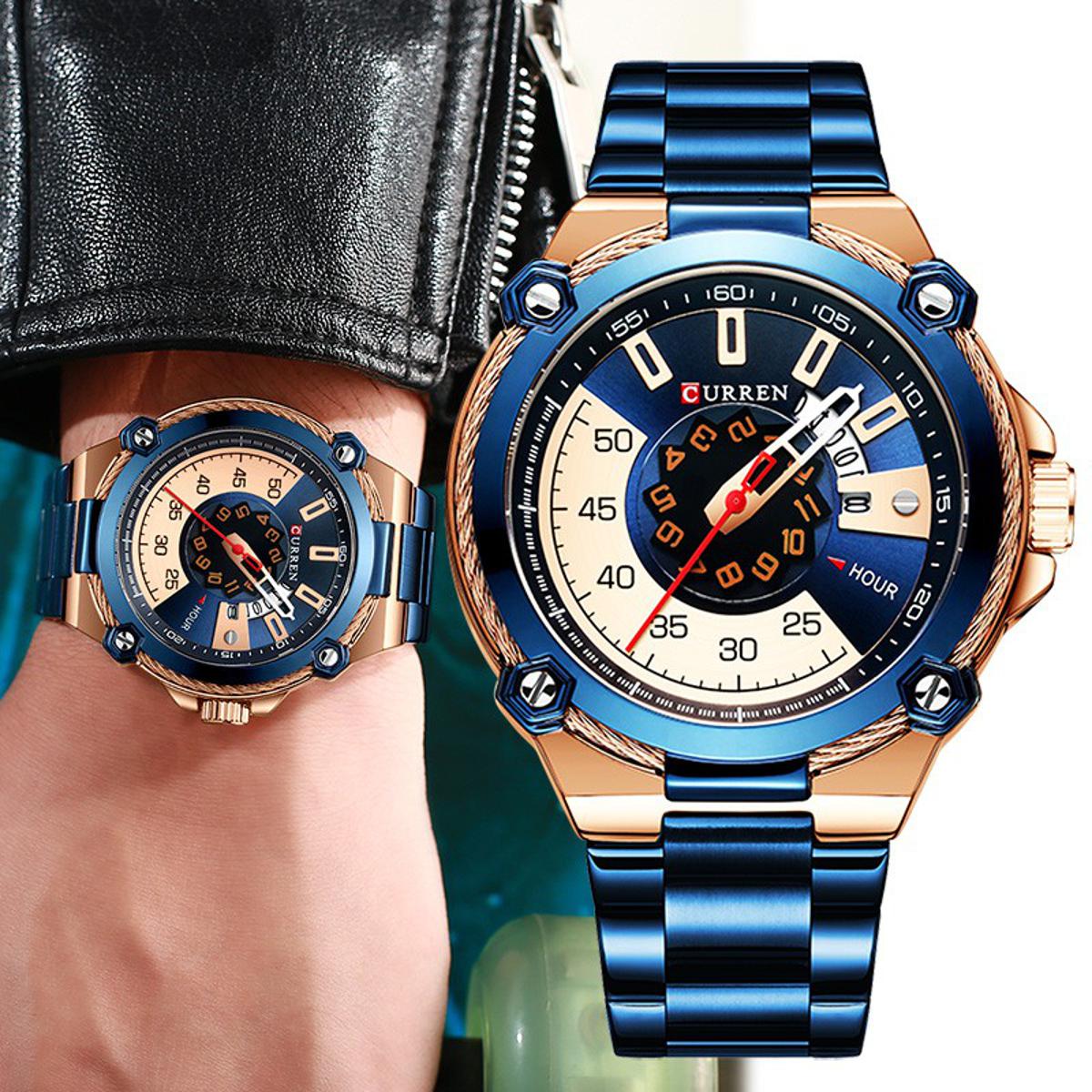 - Curren 8345 outdoor sports men’s watch featuring waterproof quartz movement, date display, durable build, fashionable casual sporty design for men.