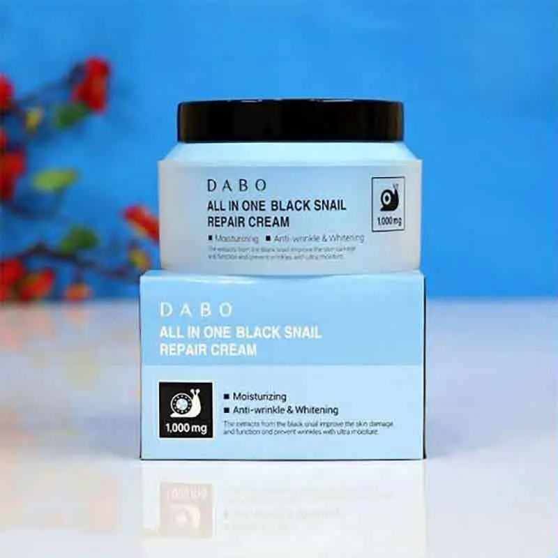 - Dabo All-in-One Black Snail Repair Cream.• Suitable for Normal, Sensitive Skin, All Skin Types.• Cream form for easy application on face.• 1000mg volume for long-lasting use.• Contains black snail extract for skin repair.• Store in dry and cool place.• Made in Korea.• Ideal for daily moisturizing and