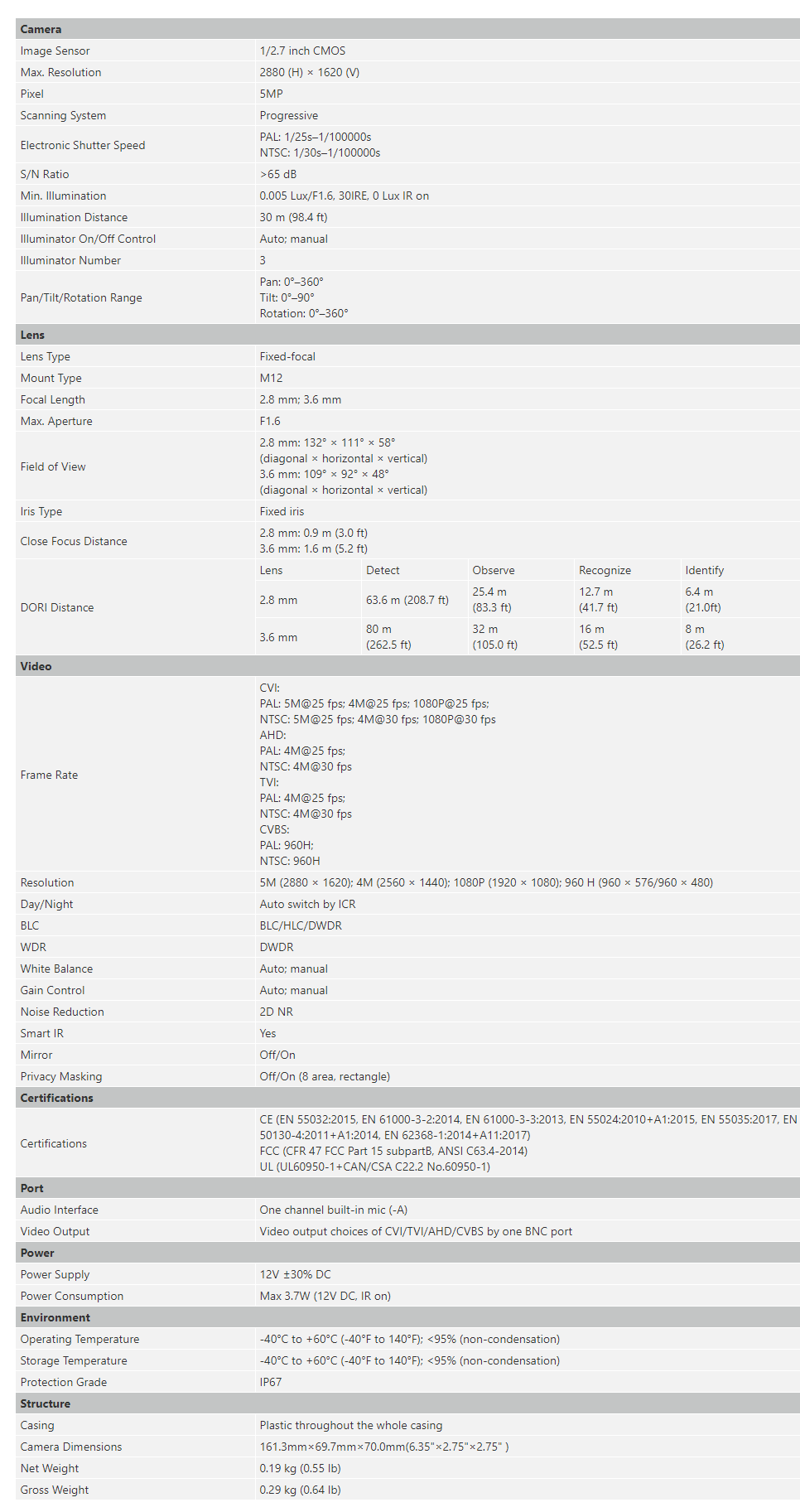 - 3.6 mm fixed lens (2.8 mm optional)