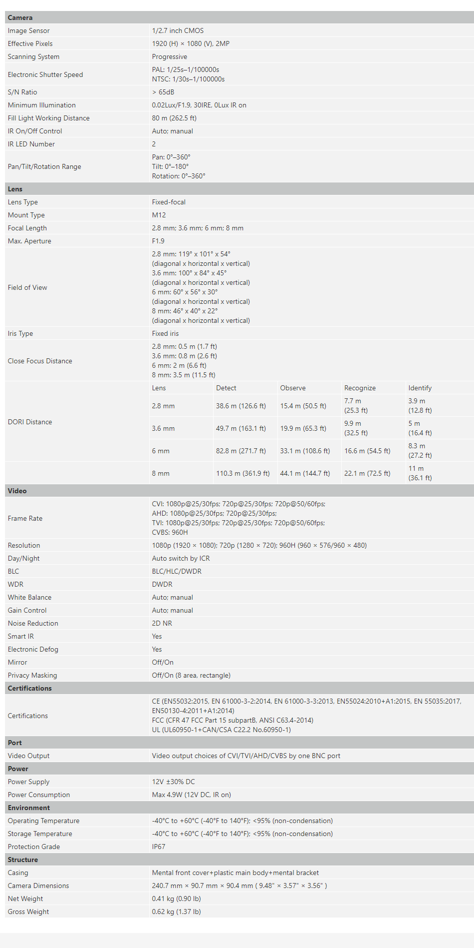 - 3.6 mm fixed lens (2.8 mm, 6 mm, 8 mm optional)