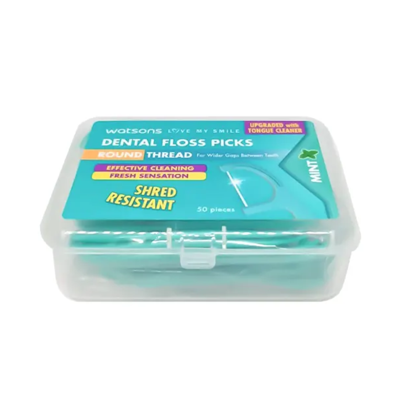 Watsons Dental Floss Picks Round Thread Mint (50 pieces) are easy-to-use dental care tools designed to remove food particles and plaque from between teeth, helping to maintain oral hygiene and fresh breath. Infused with a refreshing mint flavor, they provide a clean and cool sensation after every use.