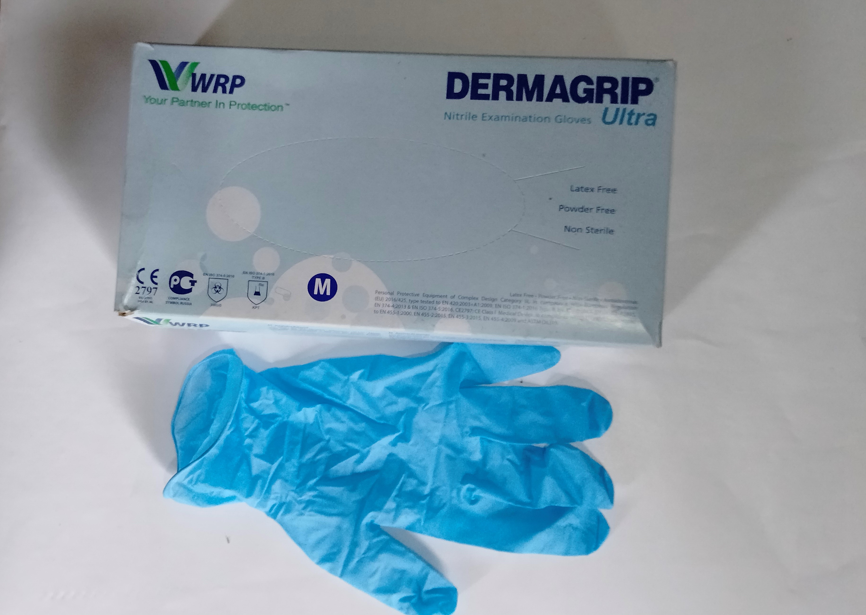 Nitrile Examination Gloves Ultra LT100 gloves per BoxPowder-freeAmbidextrousTextured surface at fingersBeaded cuffBrand DERMAGRIPOrigin Malaysia