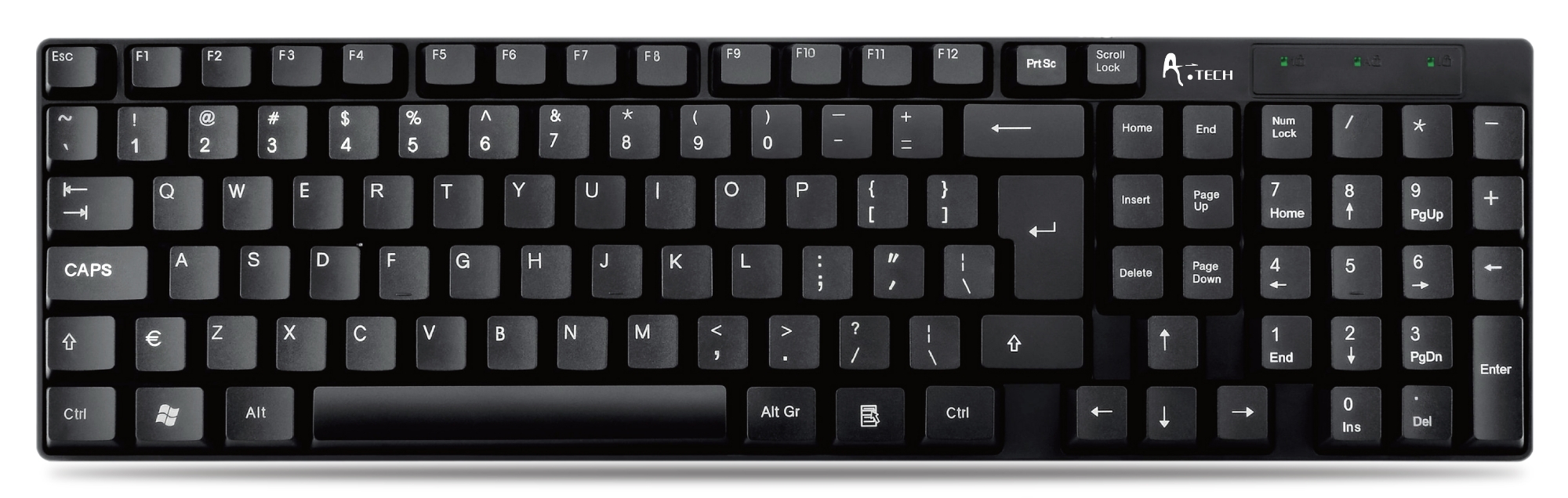 Full-size keyboard with palm rest for comfortable typing. Concave keys with softly rounded edges let your fingertips glide from key to key and barely make a sound.