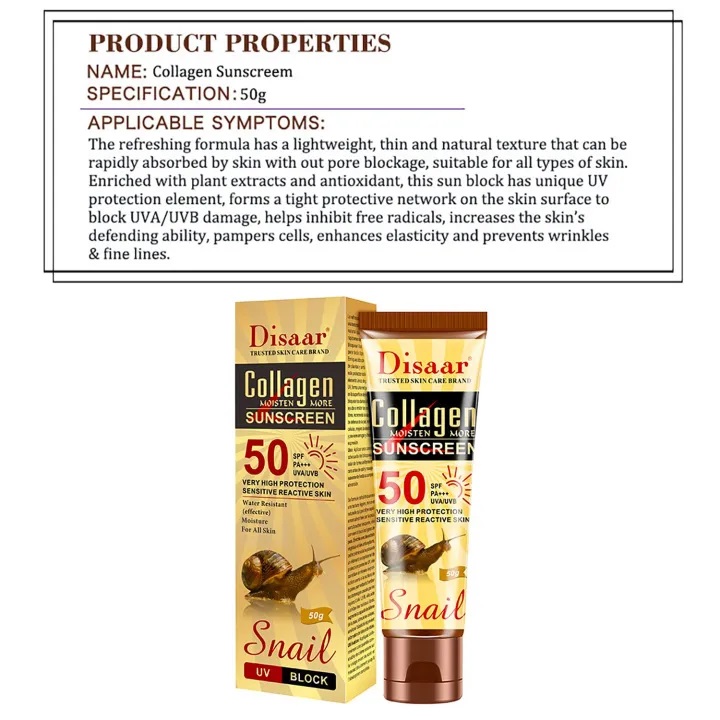 - Disaar Snail Collagen Sunscreen Cream SPF50 PA+++ 50gm
