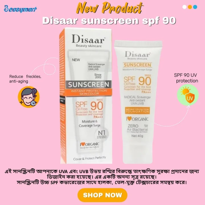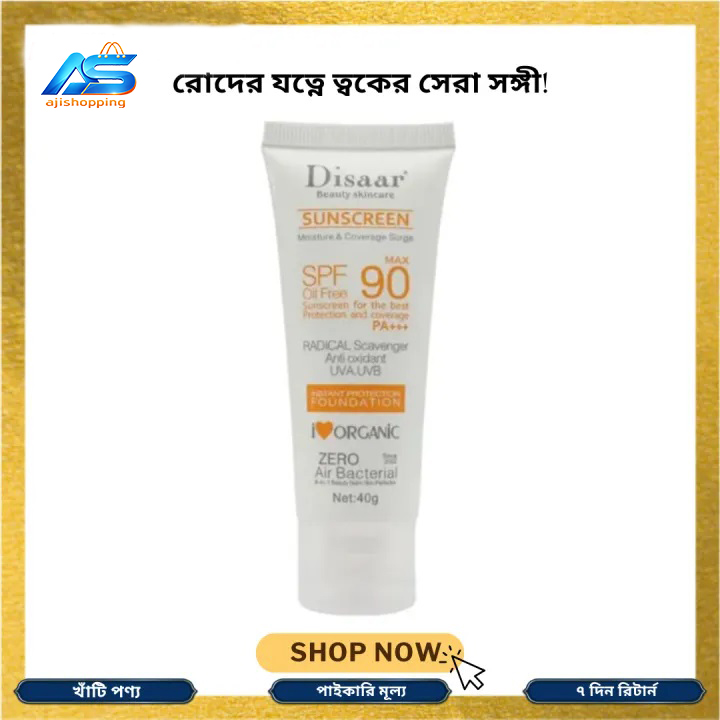 Product details of Disaar Sunscreen SPF 90 Instant Protection UVA UVB Foundation PA+++ Oil Free Sunblock Cover Protect Perfectly Moisturizing Coverage Surge 40g