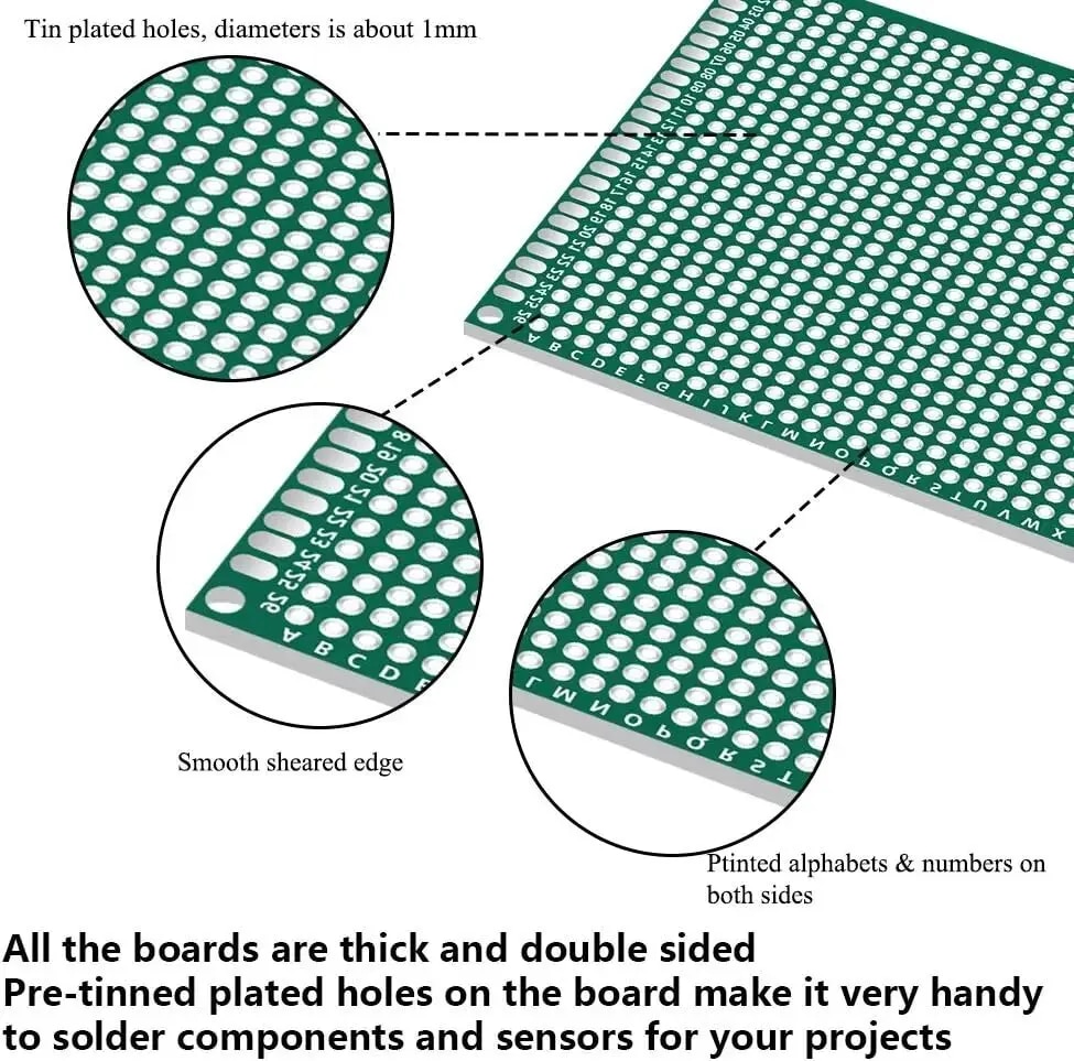 • Lettering on both side of the PC board makes it easier for prototyping projects, Cuttable fiber glass and FR-4 flame resistant good for soldering,Muti Pins, easy to cut and solder with appropriate tools. Flux for easy soldering and extended serving life of printed blank plating thru perforated board.