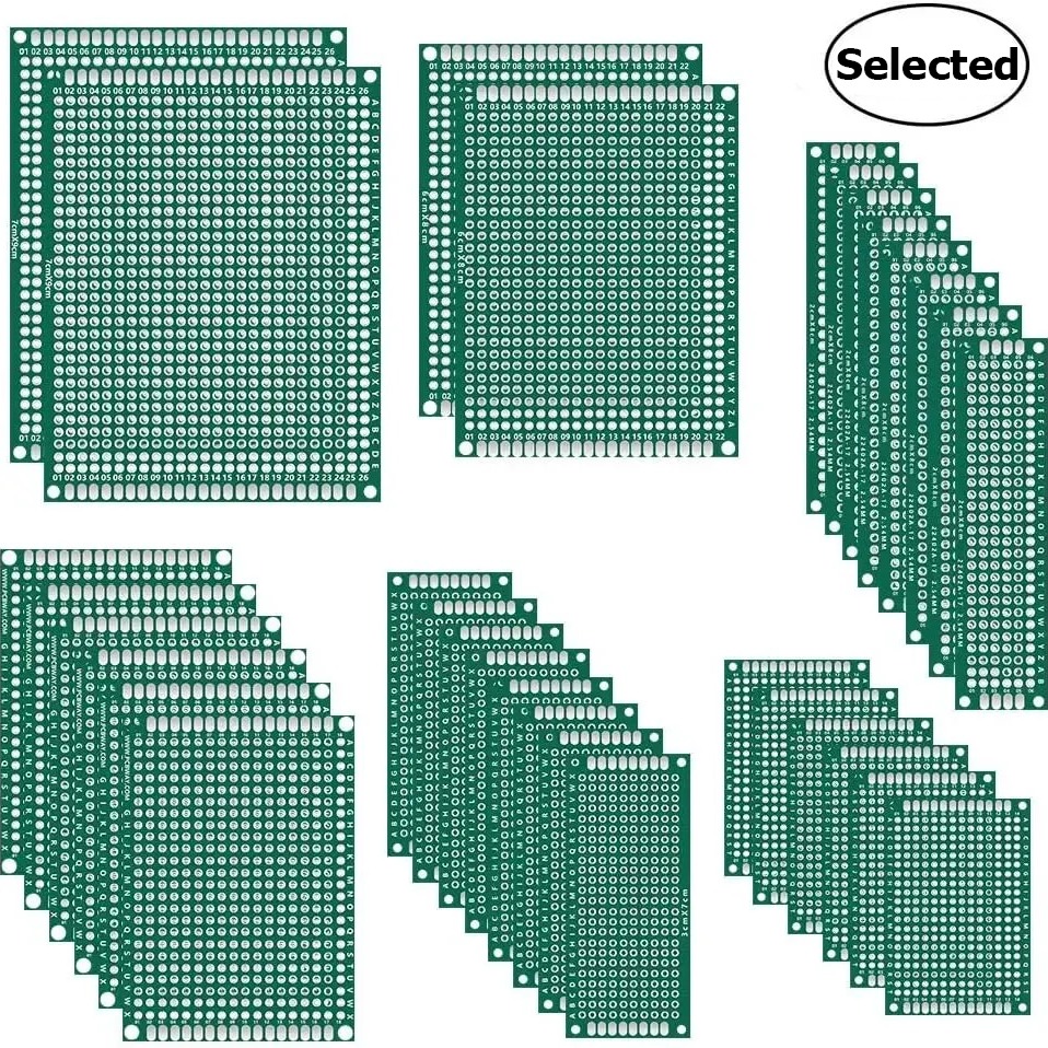 • 32 pieces double-sided prototype boards of 6 different size to meet your demands, for electronic experiments and DIY projects.