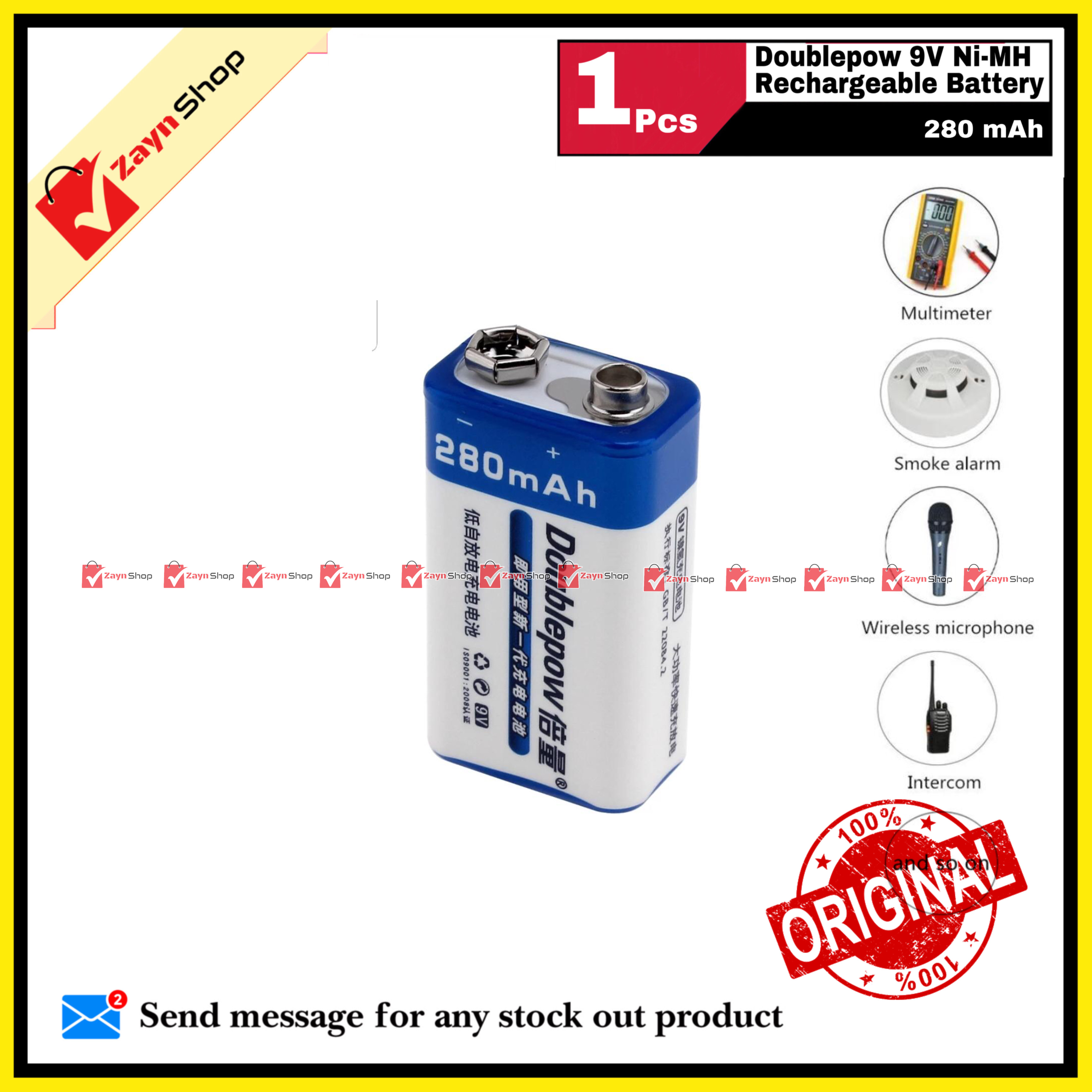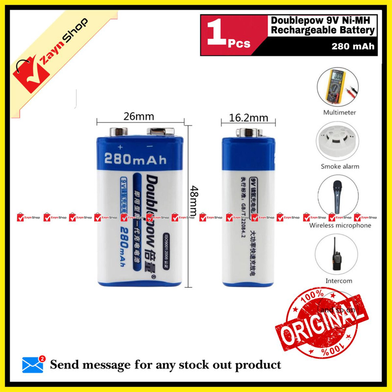 - DoublePow 9 Volt Rechargeable Battery - 280 mAh DoublePow 9 Volt Rechargeable Battery