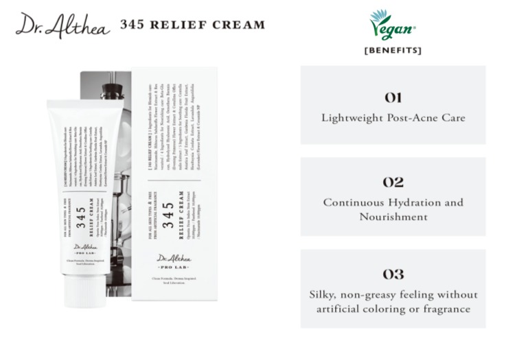 Dr. Althea 345 Relief Cream is a lightweight, vegan-friendly moisturizer designed to soothe, hydrate, and protect sensitive or acne-prone skin. With a silky, non-greasy formula, it delivers continuous nourishment without artificial fragrance or coloring, making it perfect for daily use.