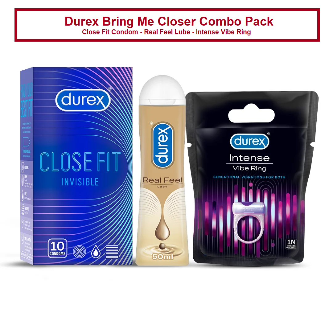 Durex Bring Me Closer Combo Pack Of Invisible Close Fit Condom - Real Feel Lube Gel - Intense Vibe Ring