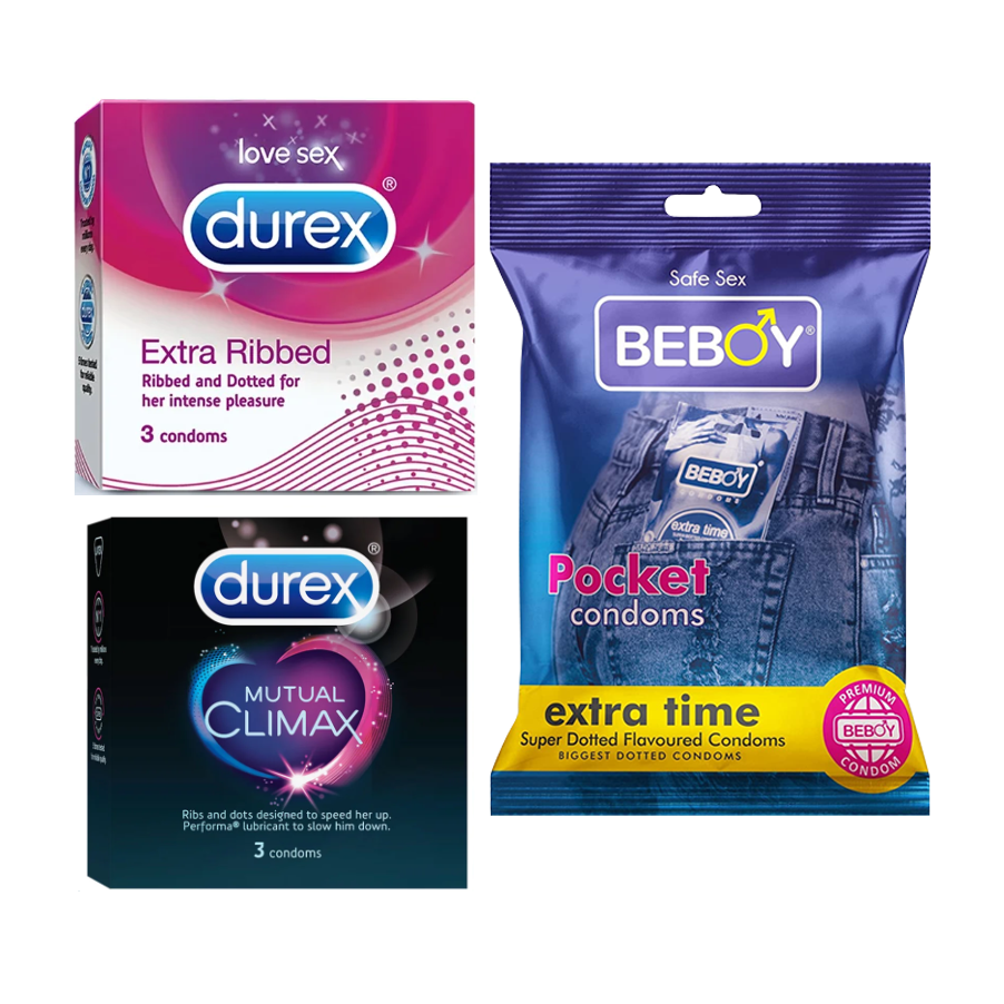 Durex FortifyShield Combo = 9Pcs Condom + Durex Extra Ribbed 3s + Durex Mutual Climax 3s + Beboy Extra Time 3s Condom