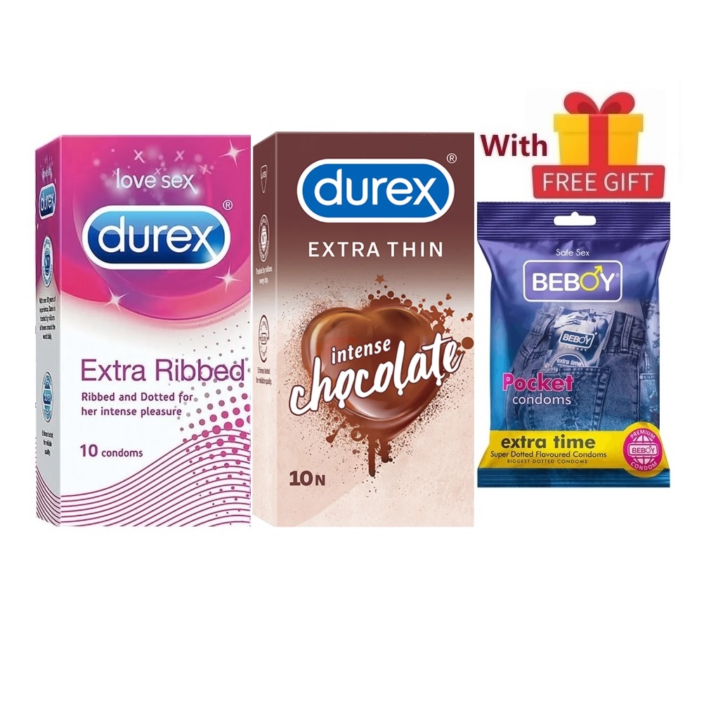 Durex LoveWrap Combo = 23Pcs Condom + Durex Extra Ribbed 10s + Durex Extra Thin Chocolate 10s + Beboy Extra Time Paan 3s + Free Gift
