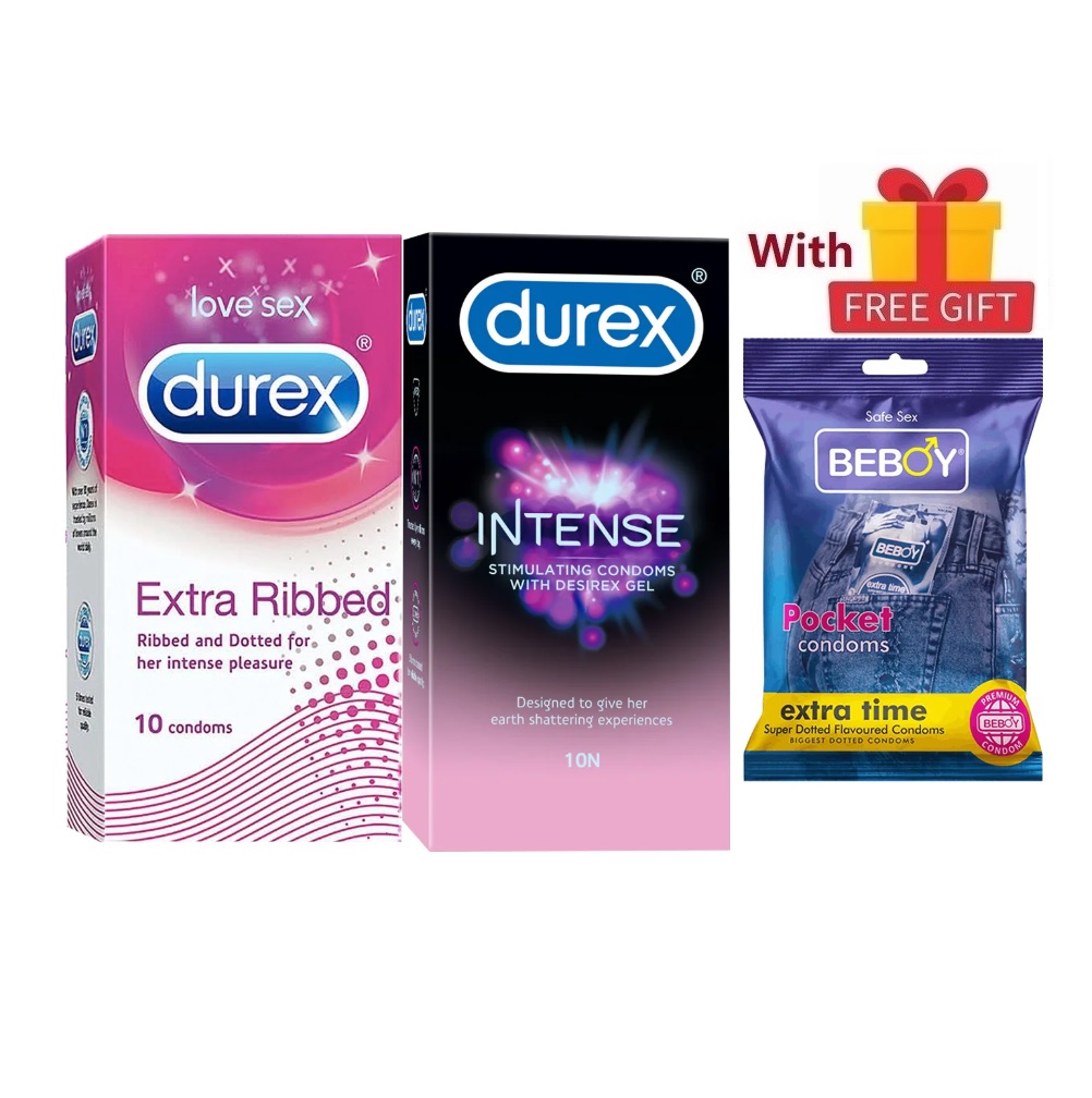 Durex PureGuard Combo = 23Pcs Condom + Durex Extra Ribbed 10s + Durex Intense 10s + Beboy Extra Time Paan 3s + Free Gift