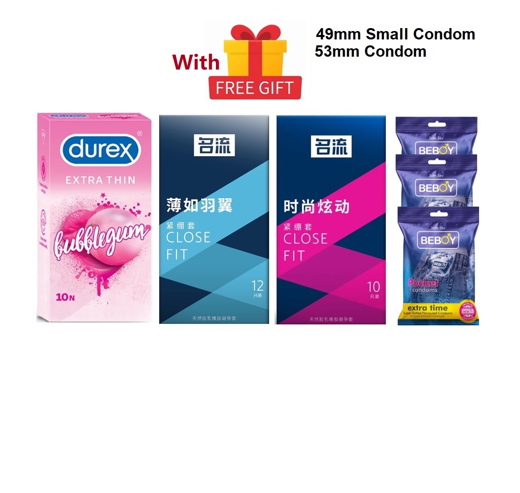 Durex Small Condom Combo = 41Pcs + Durex BubbleGum 10s + Celebrity Close Fit Small 12s + Celebrity Close Fit 49mm Dot 10s + Beboy Extra Dotted Paan 9s + Free Gift
