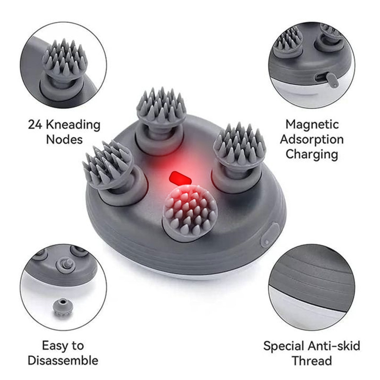 এটির ঘূর্ণায়মান ৪টি নরম সিলিকন ম্যাসেজ হেড মাথার প্রতিটি অংশে সমানভাবে কাজ করে রক্ত সঞ্চালন বাড়ায়, টেনশন কমায় এবং চুলের গোড়া শক্ত করে।