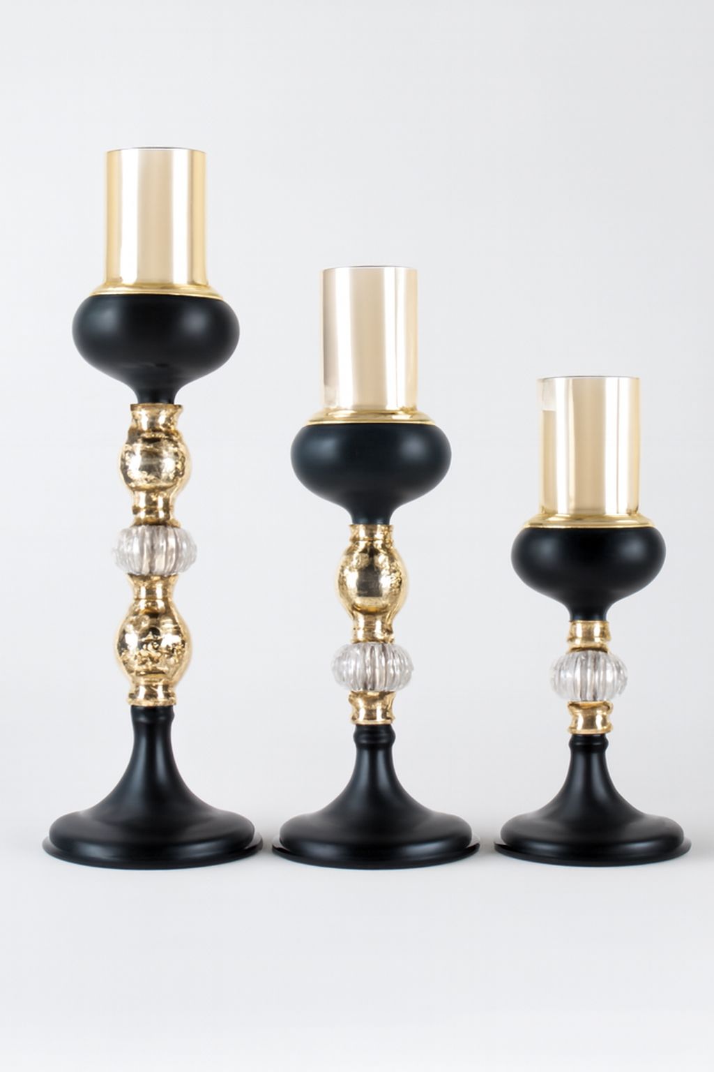 Description: Add a touch of sophistication and luxury to your living space with our Elegant Black and Gold Candle Holder Set. Each piece is designed to perfectly blend modern aesthetics with classic charm, making it an ideal addition to any room. Crafted from premium materials, the candle holders feature black bases with gleaming gold accents, complemented by delicate glass detailing for an added touch of elegance.