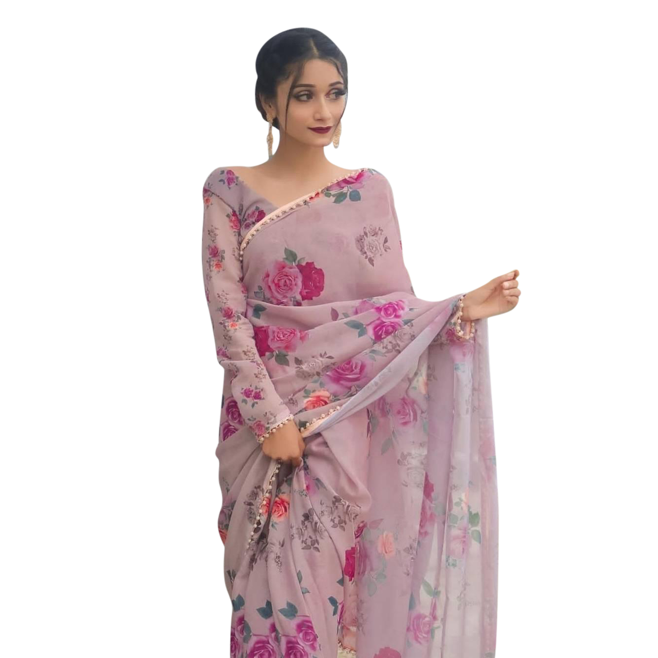 Elegant Purple Georgette Printed Pearl Lace Saree with Matching Blouse | Dress for Women - শাড়ি - Graceful & Charming Attire - Pink