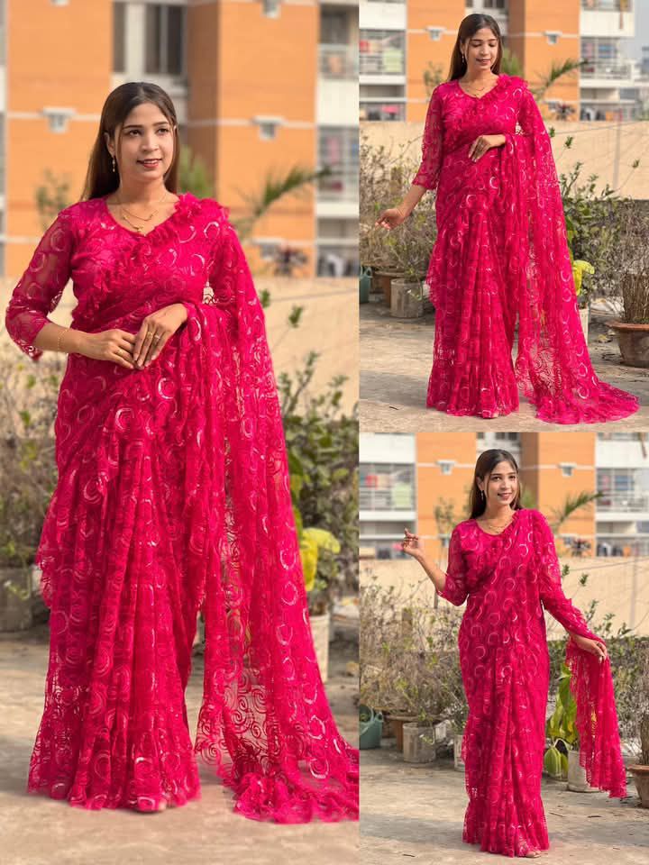 Exclusive Design Clasic রেডিমেড শাড়ি কালেকশন Net frbric Saree for women - Red