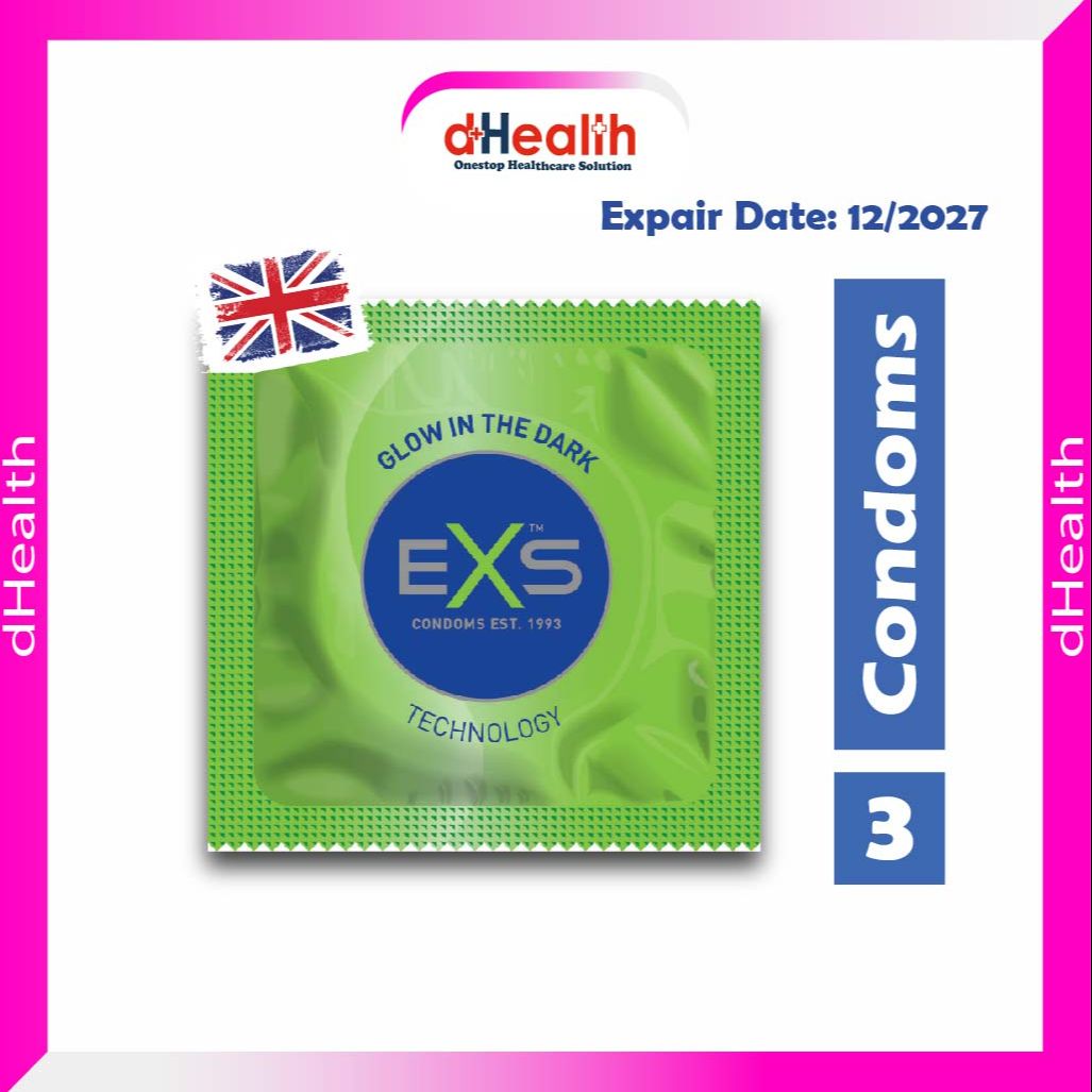 Smooth, plain, natural latex, flared, teat ended, and silicone lubricated condom. Amaze your partner with the EXS Glow in the Dark Condom. Simply hold the condom up to a light whilst in the condom wrapper then after 45 seconds put the condom on and be ready to glow! Size: • Width: 53mm • Thickness: 0.073mm • Length: 192mm Why EXS Condoms: • Latex rubber condoms • Kitemarked • CE Marked • Vegan and PETA approved • No latex smell • Silicone based lubricated, non-spermicidal lubricant • Alcohol-free • Contains: Natural rubber latex and water based lubricant.