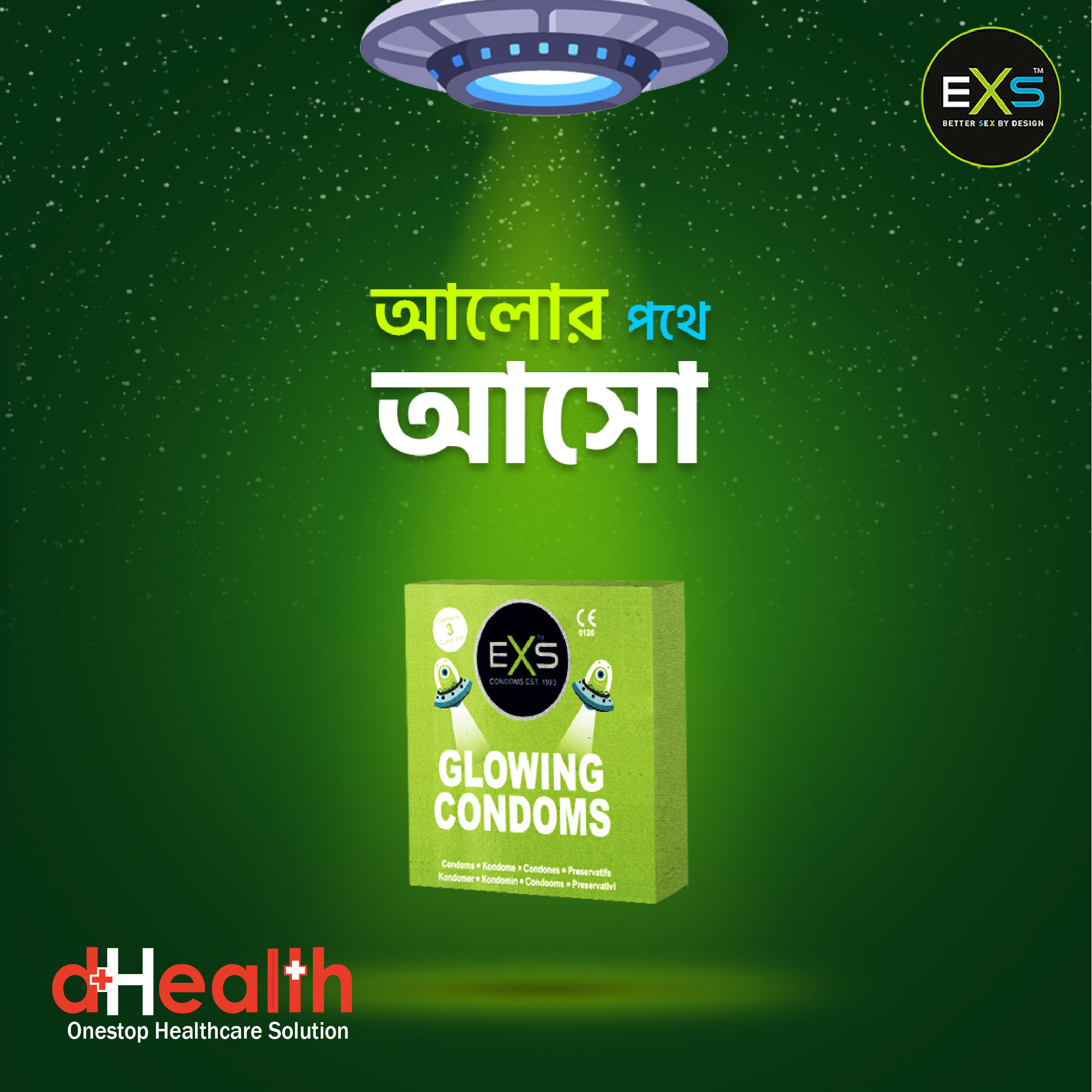 EXS গ্লো ইন ডার্ক কনডম একক প্যাক 3x1=3 পিসি (যুক্তরাজ্যে তৈরি)