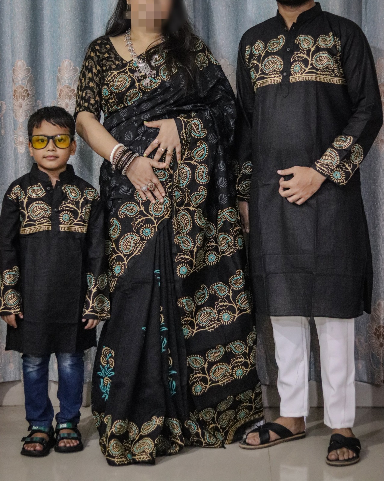 Family Set Block Print Dhupian Silk Exclusive Couple Dress Black Color Saree and Panjabi for Men women and Son - Black