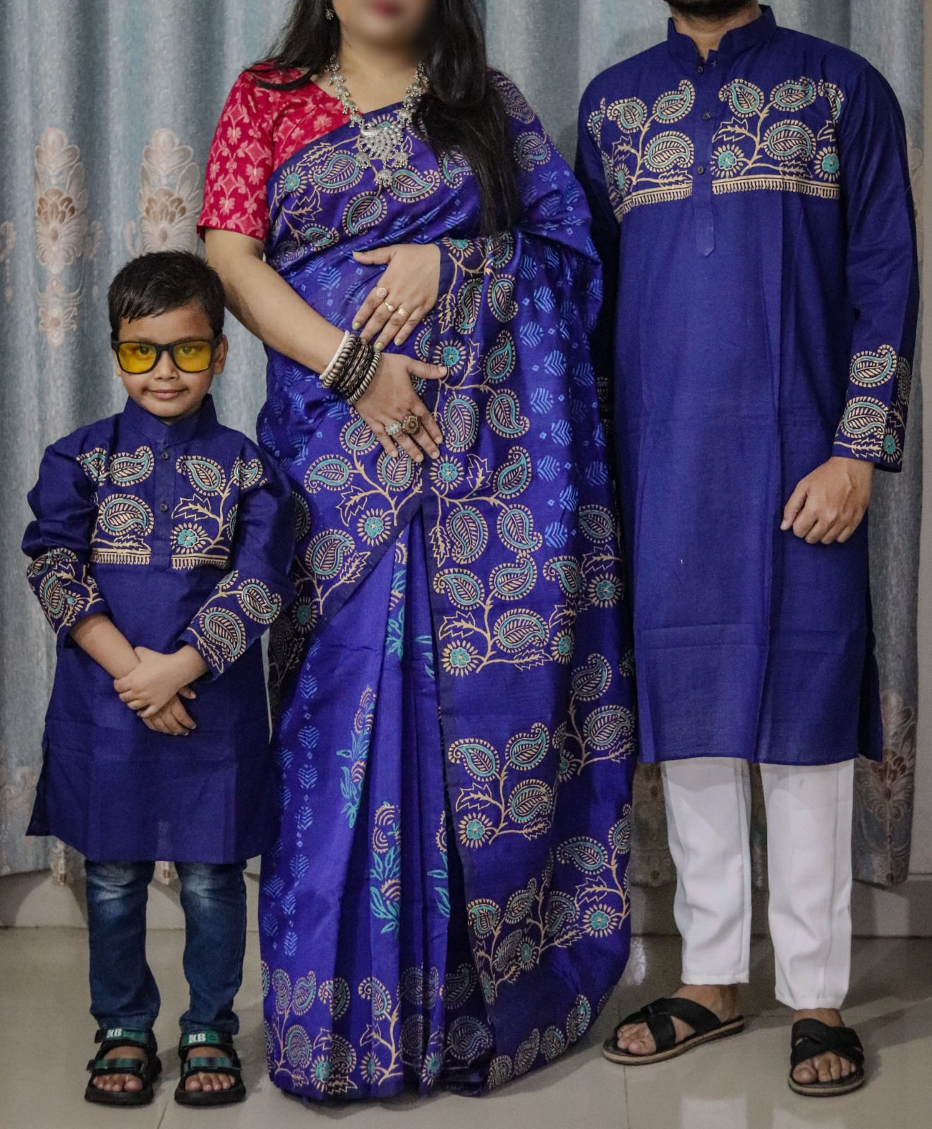 Family Set Block Print Dhupian Silk Exclusive Couple Dress Deep Blue Color Saree and Panjabi for Men women and Son - Blue