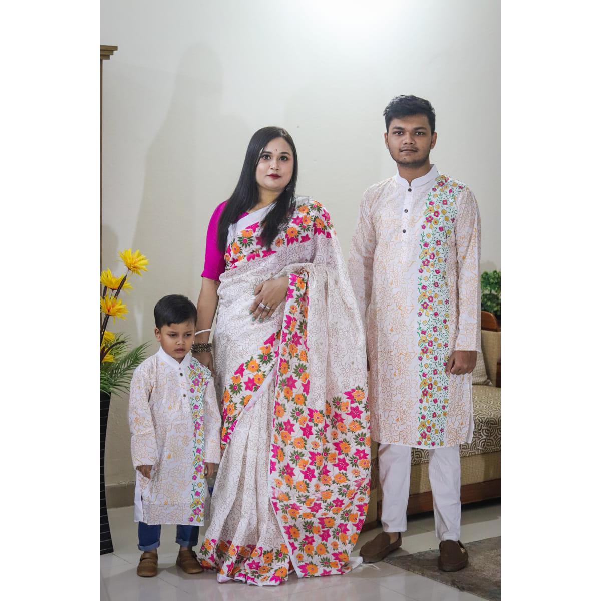 Family Set Block Print Dhupian Silk Exclusive Couple Dress Deep White Color Saree and Panjabi for Men women and Son - White