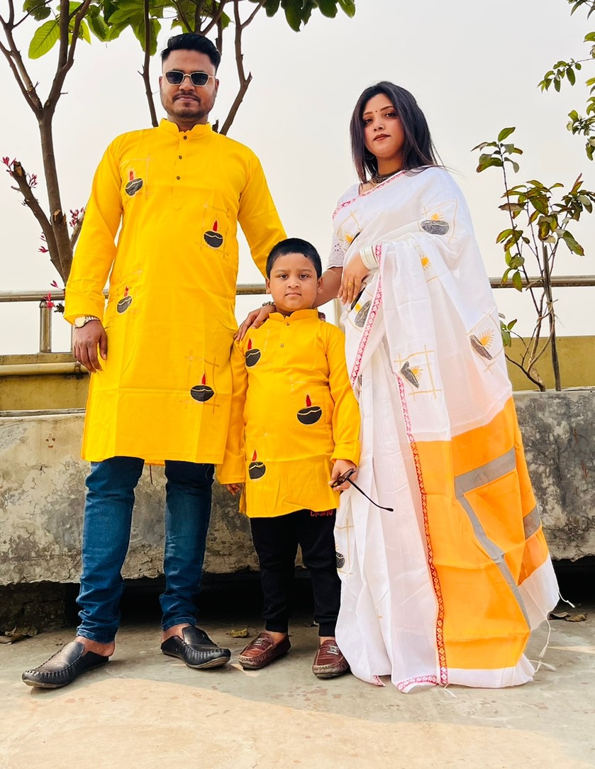Family Set Block Print Dhupian Silk Exclusive Couple Dress Deep White Color Saree and Panjabi for Men women and Son - White