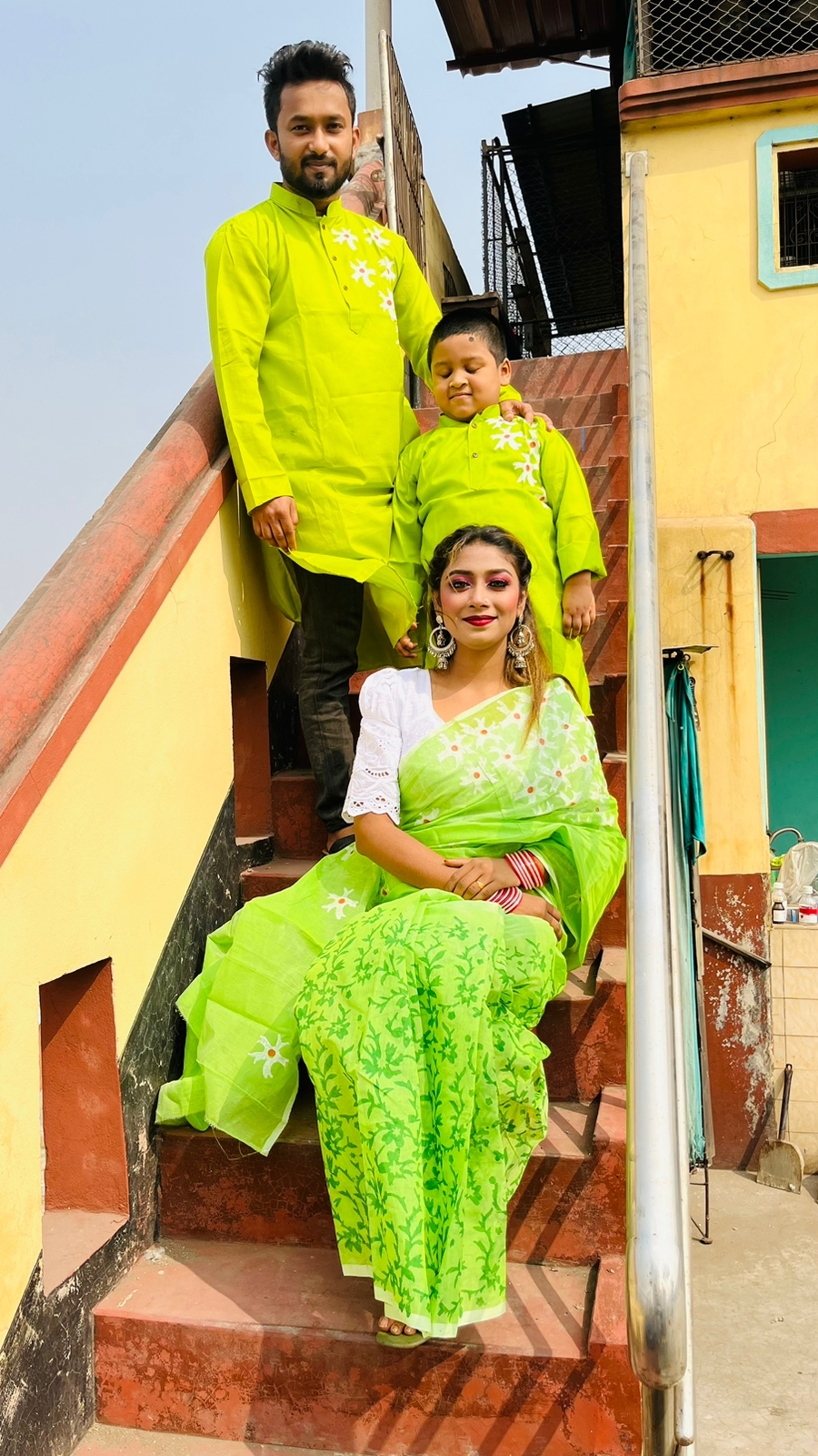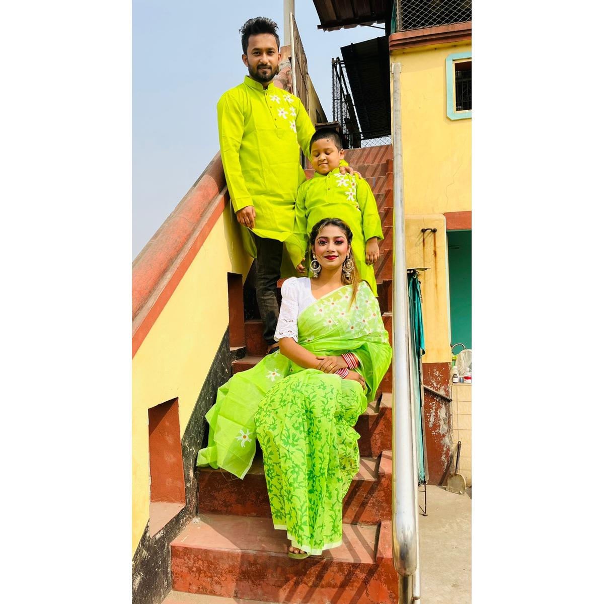 Family Set Block Print Dhupian Silk Exclusive Couple Dress Lemon Color Saree and Panjabi for Men women and Son - Lemon Yellow