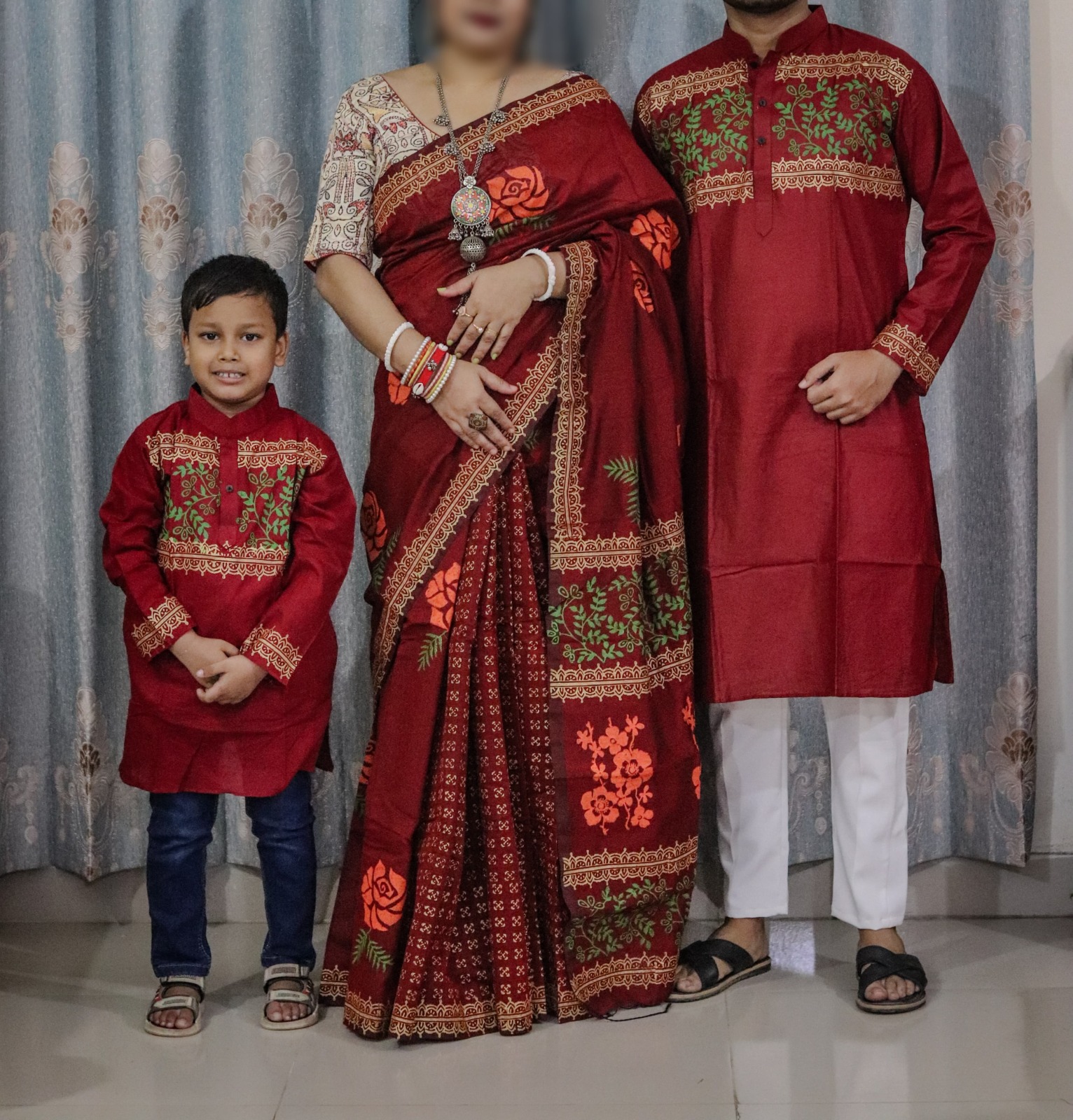 Family Set Block Print Dhupian Silk Exclusive Couple Dress Maroon Color Saree and Panjabi for Men women and Son - Maroon