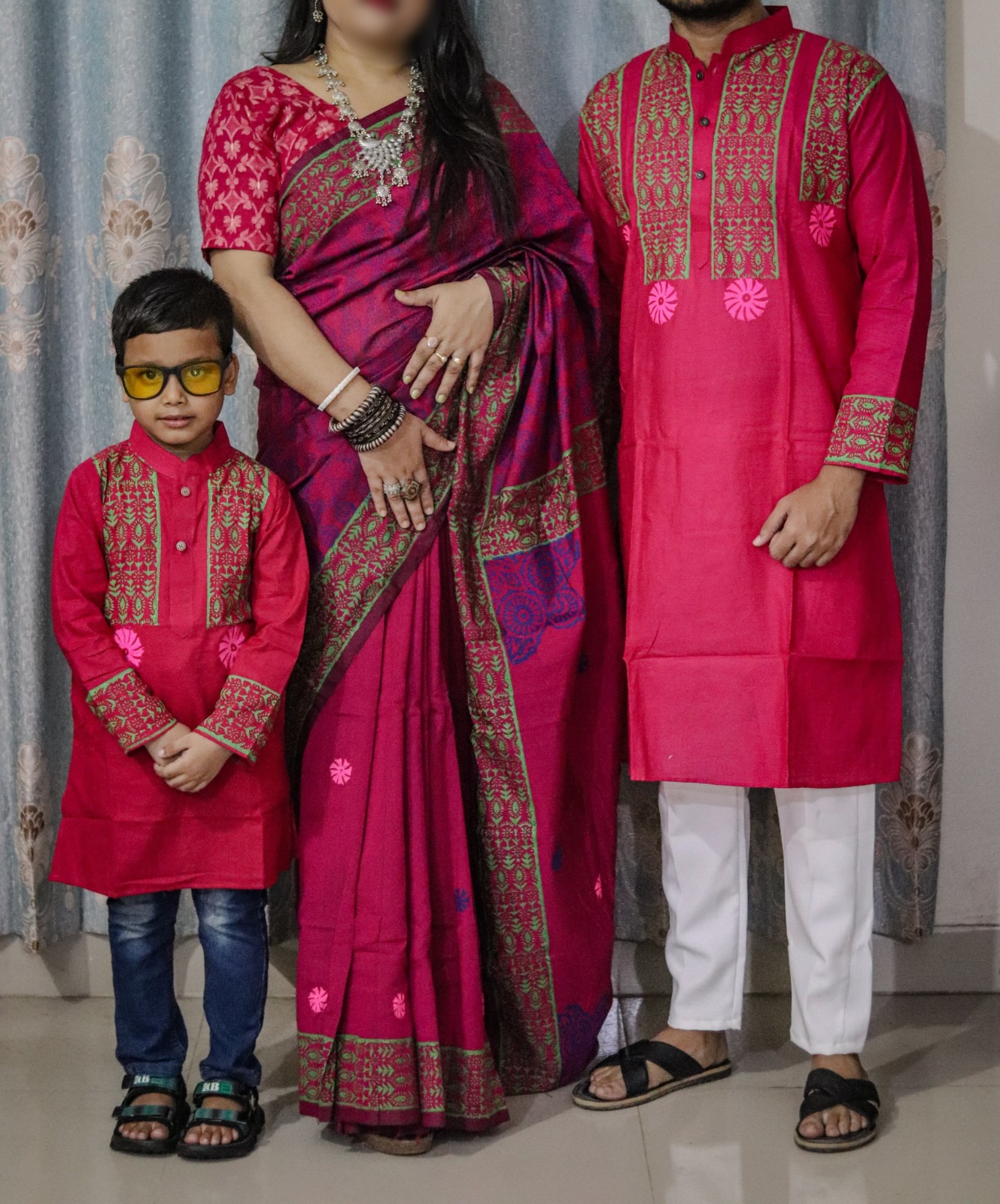 Family Set Block Print Dhupian Silk Exclusive Couple Dress Red Color Saree and Panjabi for Men women and Son - Red
