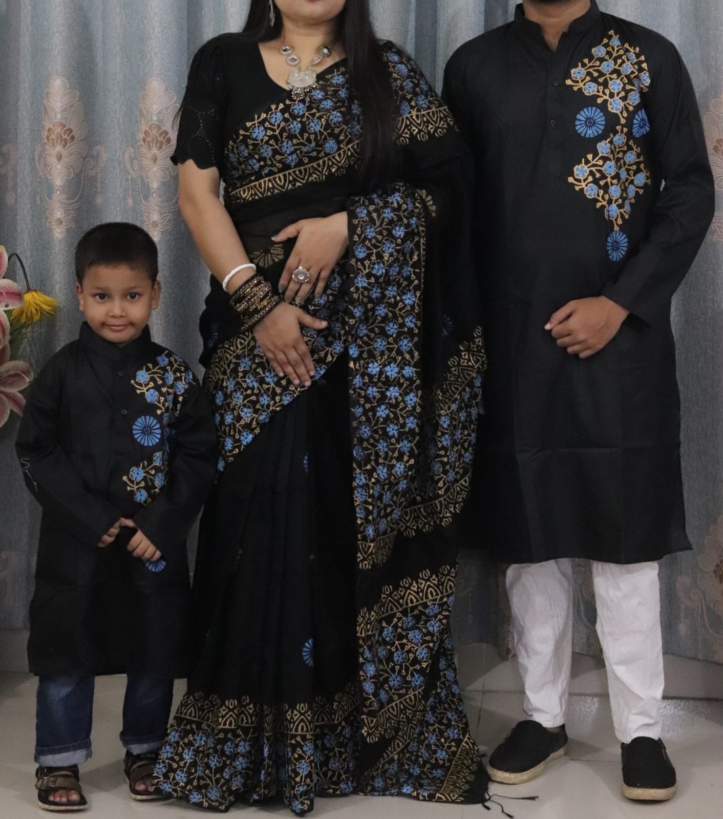 Family Set Block Print Dhupian Silk Exclusive Couple Dress White Color Saree and Panjabi for Men women and Son - Black