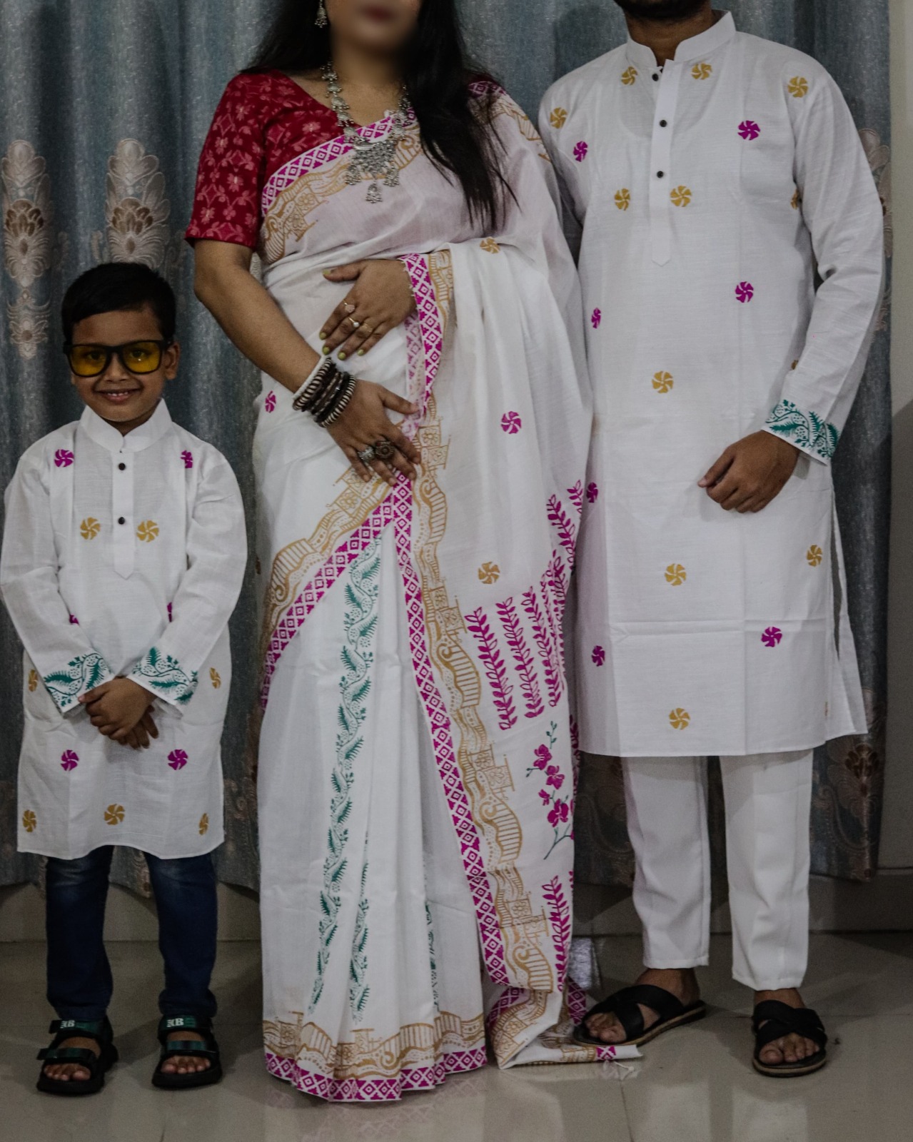 Family Set Block Print Dhupian Silk Exclusive Couple Dress White Color Saree and Panjabi for Men women and Son - White