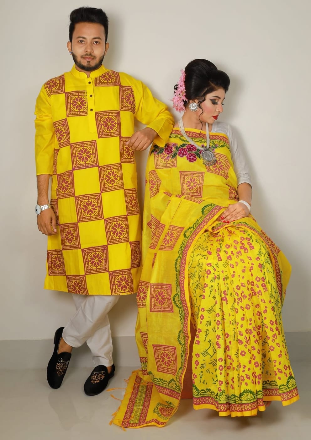 Family Set Block Print Dhupian Silk Exclusive Couple Dress Yellow Color Saree and Panjabi for Men women and Son - Yellow
