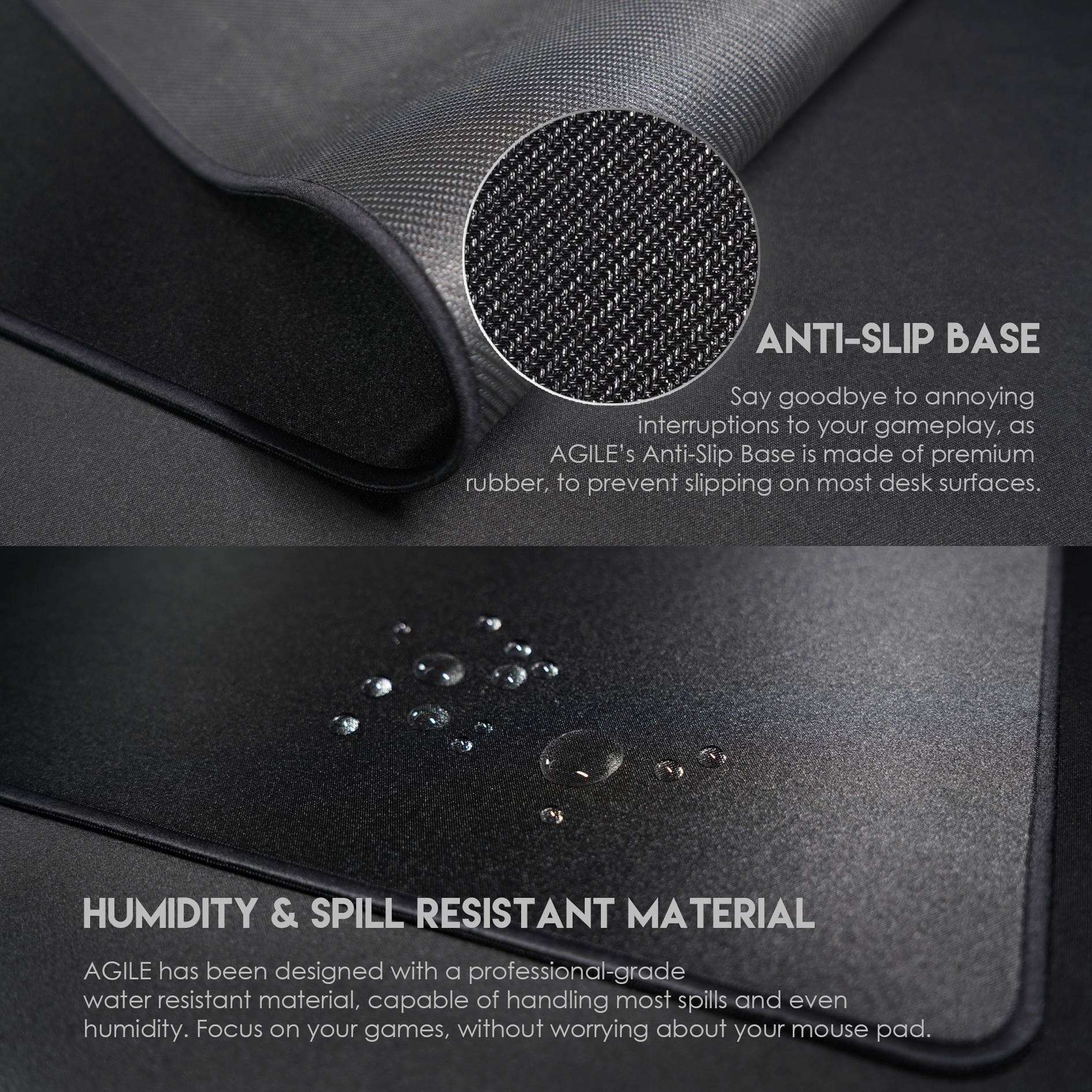 √ MOISTURE RESISTANT WITHOUT SLOW SPOTS: AGILE MP903’s SPEEDSILK technology features a non-friction impacting moisture-resistant surface, to ensure your mouse pad stays clean! Our moisture-proof coating is specifically engineered to match the coefficient of friction of the surface, to prevent slow spots!