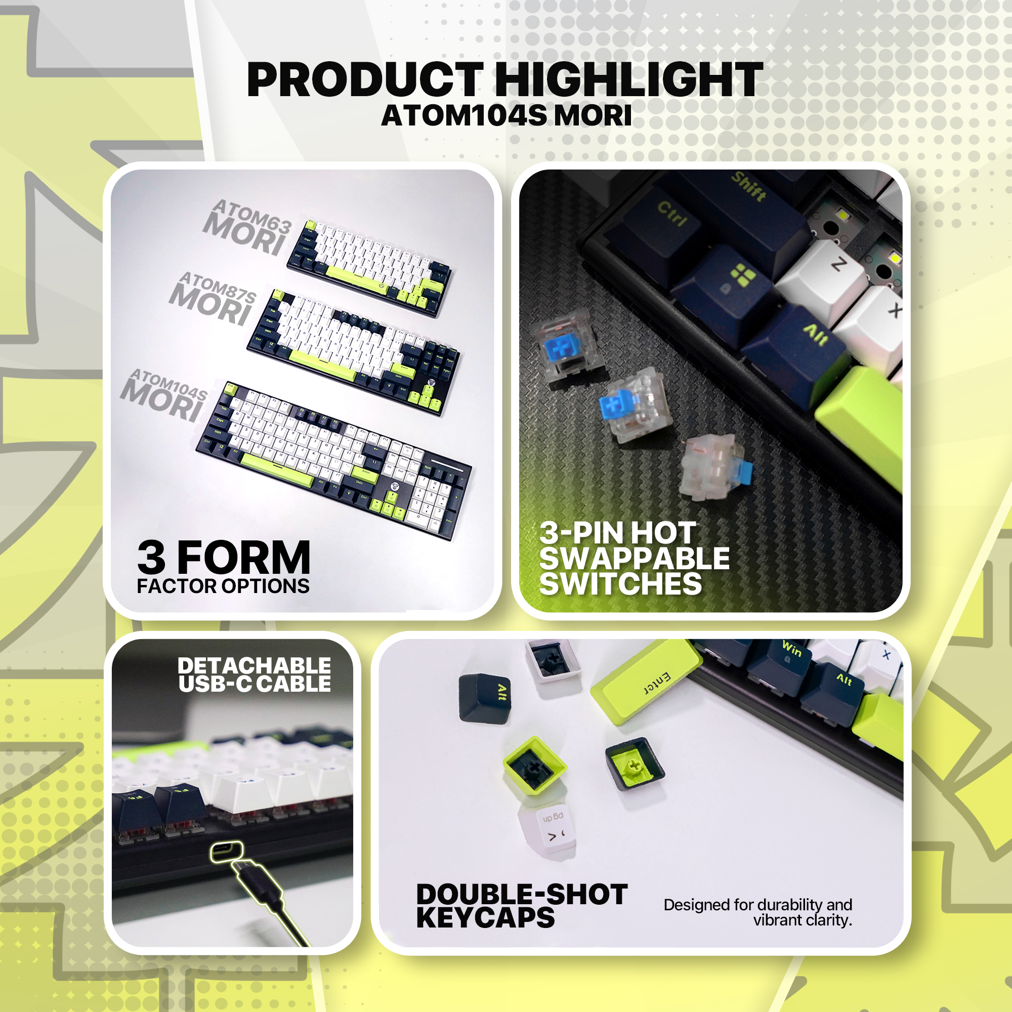 Fantech MORI Edition MK878S – ATOM104S, Pro Wired Mechanical Keyboard with RGB Lighting BlueKB SIZE: 95% Factor ; Total keys: 104LED : Spectrum RGB Illumination (12) Mode)Adjustable FeetDetachable Caps And Switch3 Color Combination Keycaps3 PIN HOT-SWAPPABLESwitch Color : Red SwitchMaterial: High Quality ABS PlasticAnti-ghosting: 25 keysDetachable USB-C Cable